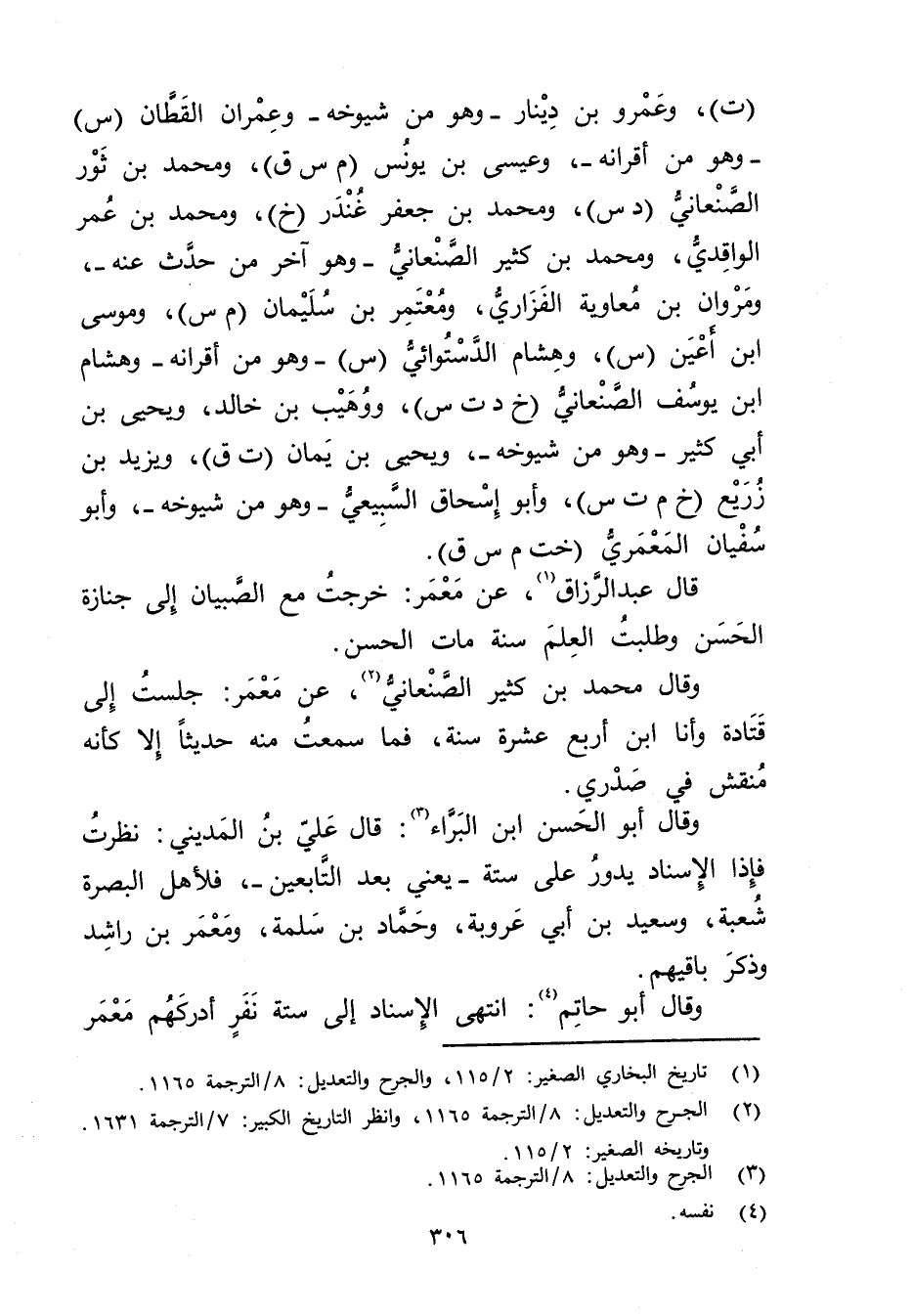 وَقَال أَبُو الحسن بْن البراء (3) : قال عَلِي بْن المديني: نظرت فإذا الإسناد يدور على ستة، يعني بعد التابعين، فلأهل البصرة شعبة. وسَعِيد بْن أَبي عَرُوبَة، وحماد بْن سلمة، ومَعْمَر بْن راشِد