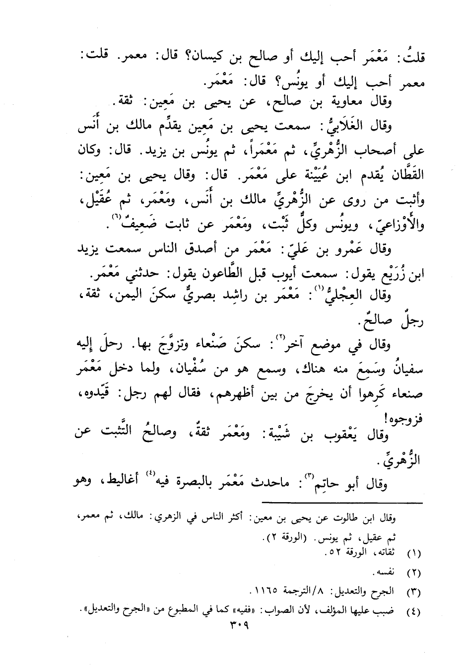 قُلْتُ: معمر أحب إليك أو صالح بن كيسان؟ قال: معمر. قُلْتُ: معمر أحب إليك أو يونس؟ قال: معمر.