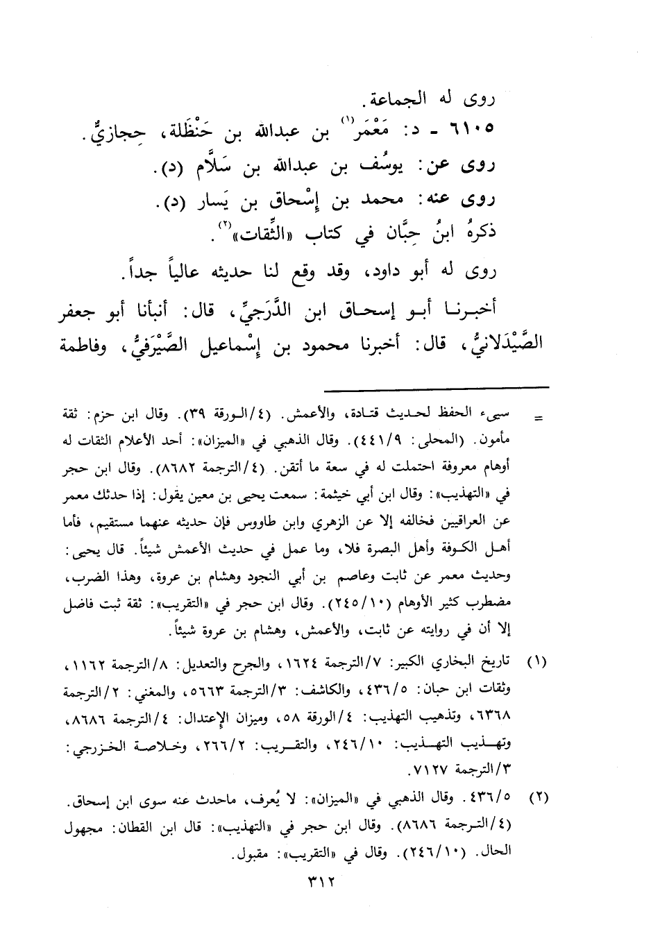 (1) تاريخ البخاري الكبير: 7 / الترجمة 1624، والجرح والتعديل: 8 / الترجمة 1162، وثقات ابن حبان: 5 / 436، والكاشف: 3 / الترجمة 5663، والمغني: 2 / الترجمة 6368، وتذهيب التهذيب: 4 / الورقة 58، وميزان الاعتدال: 4 / الترجمة 8686، وتهذيب التهذيب: 10 / 246، والتقريب: 2 / 266، وخلاصة الخزرجي: 3 / الترجمة 7127.