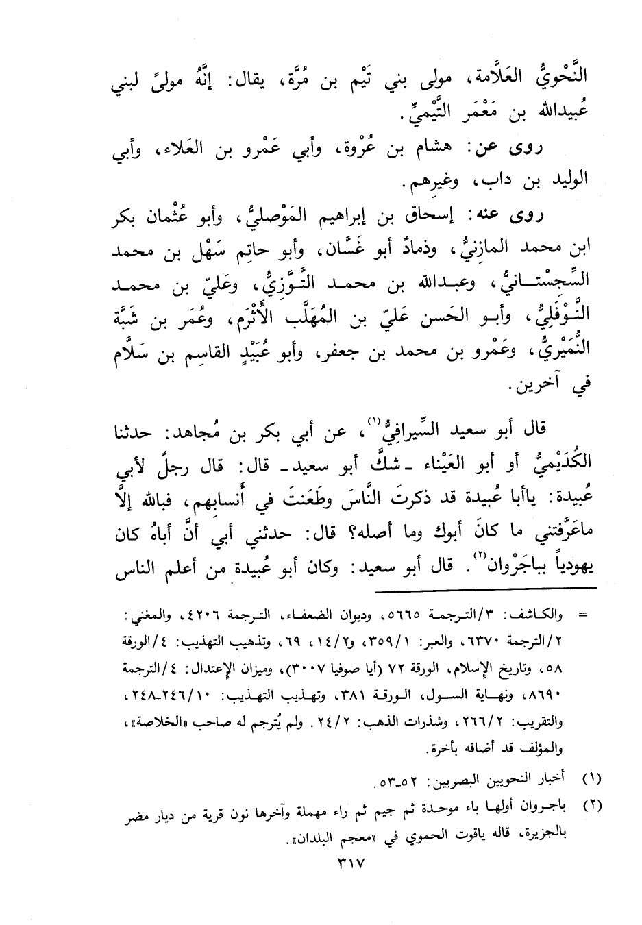 قال أَبُو سَعِيد السيرافي (1) عَن أَبِي بكر بْن مجاهد: حَدَّثَنَا الكديمي أو أَبُو العيناء - شك أَبُو سَعِيد، قال: قال رجل لأبي عُبَيدة: يَا أَبَا عُبَيدة قد ذكرت الناس وطعنت فِي أنسابهم فبالله إلا ما عرفتني ماكان أبوك وما أصله؟ قال: حَدَّثني أَبِي أن أباه كَانَ يهوديا بباجروان (2) قال أَبُو سَعِيد: وكان أَبُو عُبَيدة من أعلم الناس