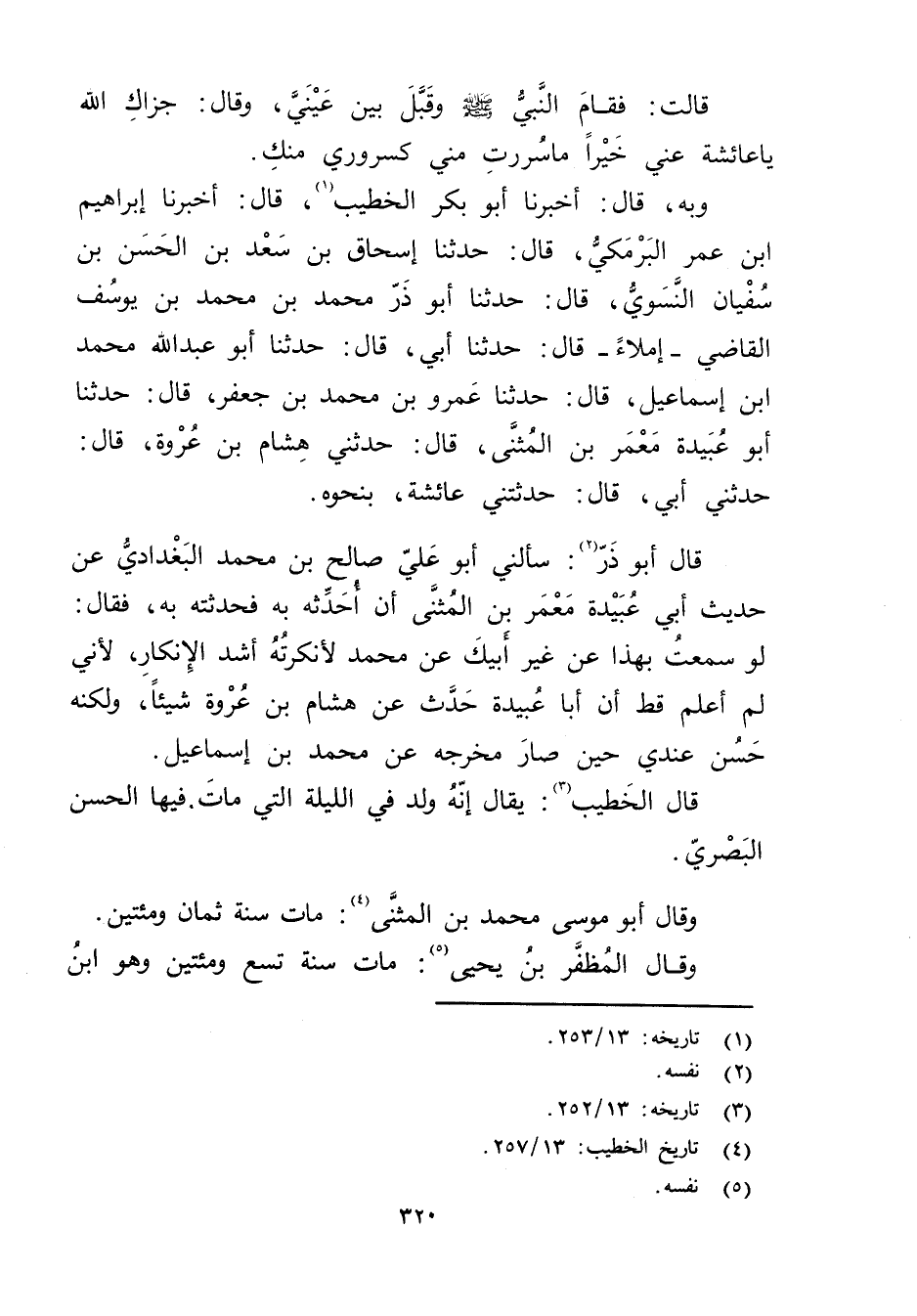 وبِهِ قال: أخبرنا أَبُو بَكْر الخطيب (1) قال: أَخْبَرَنَا إبراهيم ابن عُمَر الْبَرْمَكِيُّ قال: حَدَّثَنَا إِسْحَاقُ بْنُ سَعْدِ بْنِ الْحَسَنِ بْنِ سُفْيَانَ النَّسَوِيُّ قال: حَدَّثَنَا أَبُو ذر مُحَمَّد بْن مُحَمَّد بْن يُوسُفَ الْقَاضِي - إِمْلاءً، قال: حَدَّثَنَا أَبِي قال: حَدَّثَنَا أَبُو عَبد الله محمد ابن إِسْمَاعِيلَ قال: حَدَّثَنَا عَمْرو بْنُ مُحَمَّدُ بْنُ جَعْفَرٍ قال: حَدَّثَنَا أَبُو عُبَيدة معمر بْن المثنى قال: حَدَّثَنِي هِشَامُ بْنُ عُرْوَةَ قال: حَدَّثني أَبِي قال: حَدَّثَتْنِي عَائِشَةُ بِنَحْوِهِ.