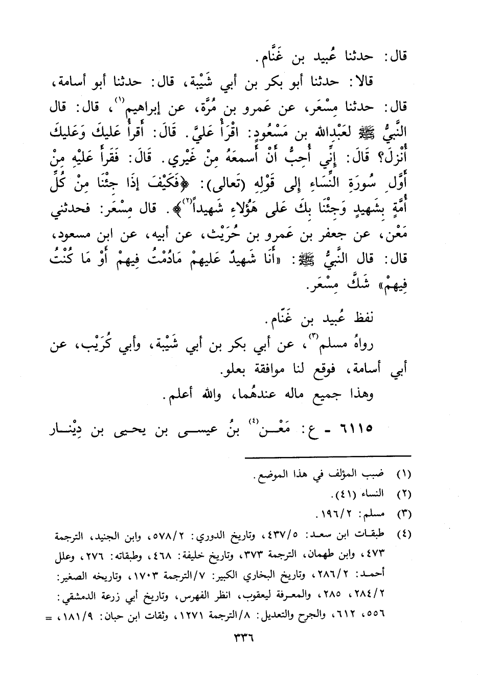 قَالا: حَدَّثَنَا أَبُو بَكْر بْن أَبي شَيْبَة، قال: حَدَّثَنَا أَبُو أُسَامَةَ، قال: حَدَّثَنَا مِسْعَرٌ، عَنْ عَمْرو بْنِ مُرَّةَ. عَنْ إِبْرَاهِيمَ (1) ، قال: قال النَّبِيُّ صلى الله عليه وسلم لعَبد اللَّهِ بْنِ مَسْعُودٍ: اقْرَأْ عَلَيَّ. قال: أَقْرَأُ عَلَيْكَ وعَلَيْكَ أُنْزِلَ؟ قال: إِنِّي أُحِبُّ أَنْ أَسْمَعَهُ مِنْ غَيْرِي. قال: فَقَرَأَ عَلَيْهِ مِنْ أَوَّلِ سُورَةِ النِّسَاءِ إلى قوله (تعالى) : (كيف إِذَا جِئْنَا مِنْ كُلِّ أُمَّةٍ بِشَهِيدٍ وجِئْنَا بِكَ عَلَى هَؤُلاءِ شَهِيدًا (2) . قال مِسْعَرٌ: فَحَدَّثَنِي مَعْنٌ، عن جعفر بْن عَمْرو بْن حُرَيْثٍ، عَن أَبِيهِ، عَنِ ابْنِ مَسْعُودٍ، قال: قال النَّبِيُّ صَلَّى اللَّهُ عليه وسلم: أَنَا شَهِيدٌ عليهم مادمت فِيهِمْ أَوْ مَا كُنْتُ فِيهِمْ" شَكَّ مِسْعَرٌ.