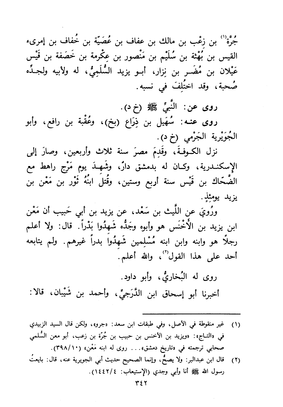 (1) غير منقوطة في الاصل، وفي طبقات ابن سعد: جرو" ولكن قال السيد الزبيدي في " التاج": ويزيد الأخنس بن حبيب بن جرة بن زعب، أبو معن السلمي صحابي ترجمته في " تاريخ دمشق" ... روى له ابنه معن" (10 / 398) .