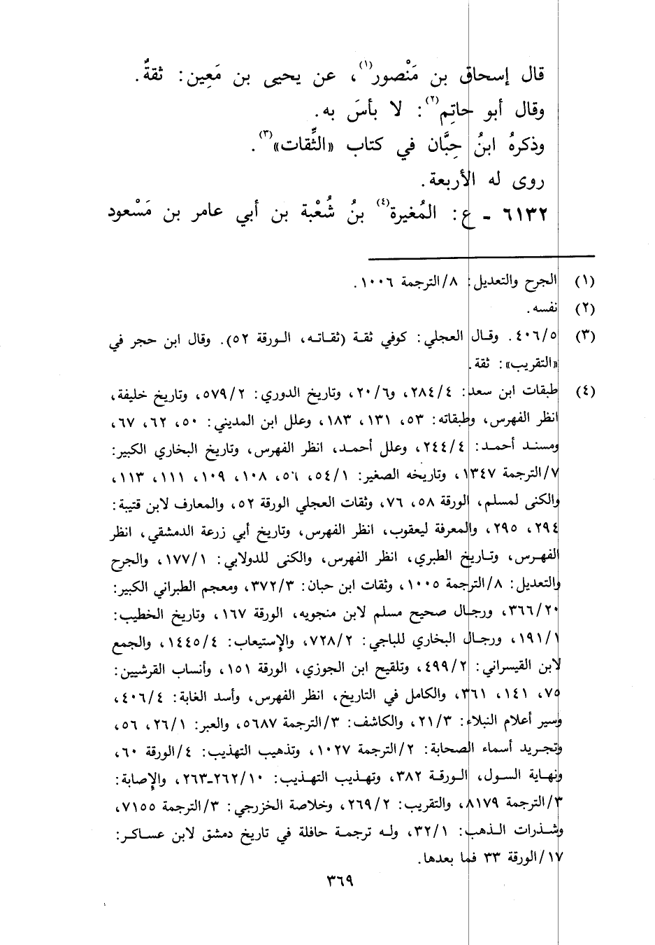 (4) طبقات ابن سعد: 4 / 284، و6 / 20، وتاريخ الدوري: 2 / 579، وتاريخ خليفة، انظر الفهرس، وطبقاته: 53, 131، 183، وعلل ابن المديني: 50، 62، 67، ومسند أحمد: 4 / 244، وعلل أحمد، انظر الفهرس، وتاريخ البخاري الكبير: 7 / الترجمة 1347، وتاريخه الصغير: 1 / 54، 56، 108، 109، 111، 113، والكنى لمسلم، الورقة 58، 76، وثقات العجلي الورقة 52، والمعارف لابن قتيبة: 294، 295، والمعرفة ليعقوب، انظر الفهرس، وتاريخ أبي زرعة الدمشقي، انظر الفهرس، وتاريخ الطبري، انظر الفهرس، والكنى للدولابي: 1 / 177، والجرح والتعديل: 8 / الترجمة 1005، وثقات ابن حبان: 3 / 372، ومعجم الطبراني الكبير: 20 / 366، ورجال صحيح مسلم لابن منجويه، الورقة 167، وتاريخ الخطيب: 1 / 191، ورجال البخاري للباجي: 2 / 728، والاستيعاب: 4 / 1445، والجمع لابن القيسراني: 2 / 499، وتلقيح ابن الجوزي، الورقة 151، وأنساب القرشيين: