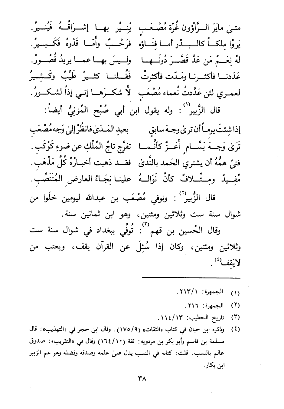 (4) وذكره ابنُ حِبَّان في كتاب "الثقات" (9 / 175) وَقَال ابن حجر في "التهذيب ": قال مسلمة بن قاسم وأبو بكر بن مردويه: ثقة (10 / 164) وَقَال في "التقريب": صدوق عالم بالنسب. قلت: كتابه في النسب يدل على علمه وصدقه وفضله وهو عم الزبير ابن بكار.