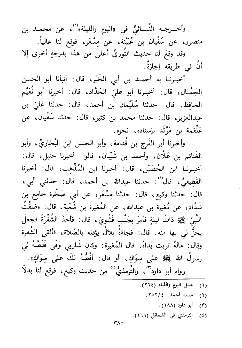 وأخبرنا أَبُو الْفَرَجِ بْنُ قُدَامَةَ، وأَبُو الْحَسَنُ بْنُ الْبُخَارِيِّ وأَبُو الْغَنَائِمِ بْن علان، وأحمد بْن شيبان قَالُوا: أخبرنا حنبل قال: أخبرنا ابْنُ الْحُصَيْنِ قال: أخبرنا ابْنُ المذاهب قال: أخبرنا القَطِيعِيّ قال (2) : حَدَّثَنَا عَبد اللَّهِ بْن أَحْمَدَ، قال: حَدَّثني أبي قال: حَدَّثَنَا وكيع قال: حَدَّثَنَا مِسْعَرٌ عَن أَبِي صَخْرَةَ جَامِعِ بْنِ شَدَّادٍ، عن مُغِيرَةَ بْنِ عَبد اللَّهِ، عَنِ الْمُغِيرَةِ بْنِ شُعْبَةَ قال: ضِفْتُ النَّبِيُّ صلى الله عليه وسلم ذَاتَ لَيْلَةٍ فَأَمَرَ بِجَنْبٍ فَشُوِيَ قال: فَأَخَذَ الشَّفْرَةَ فَجَعَلَ يَحِزُّ لِي بِهَا مِنْهُ قال: فَجَاءَهُ بِلالٌ يِؤْذِنُهُ بِالصَّلاةِ فَأَلْقَى الشَّفْرَةَ وَقَال: مَالَهُ تَرِبَتْ يَدَاهُ قال الْمُغِيرَةُ: وكَانَ شَارِبِي وفَى فَقَصَّهُ لِي رَسُولُ اللَّهِ صَلَّى اللَّهُ عليه وسلم عَلَى سِوَاكٍ أَوْ قال: أَقُصُّهُ لَكَ عَلَى سِوَاكٍ.