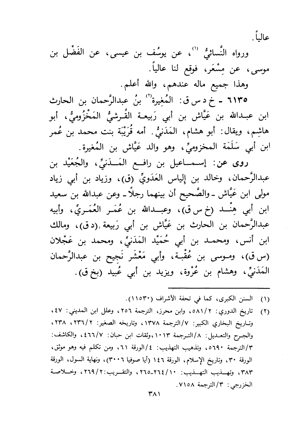 6135 - خ د س ق: المغيرة بن عَبْد الرحمن بن الحارث ابن عَبد اللَّهِ بْن عياش (2) بْن أَبي ربيعة القرشي المخزومي أَبُو هاشم ويُقال: أَبُو هشام المدني أمه قريبة بنت مُحَمَّد بْن عُمَر ابن أَبي سلمة المخزومي وهو والد عياش بْن المغيرة.