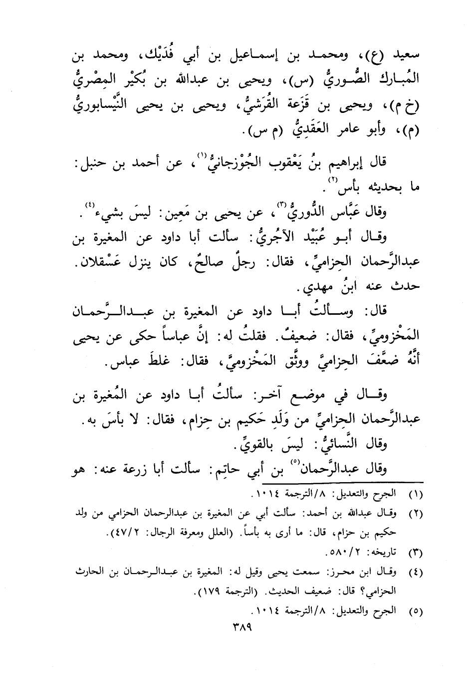 (2) وَقَال عَبد اللَّهِ بْن أَحْمَد: سَأَلتُ أبي عَنِ الْمُغِيرَةِ بْنِ عَبْدِ الرَّحْمَنِ الحزامي من ولد حكيم بْن حزام قال: ما أرى بِهِ بأسا (العلل ومعرفة الرجال: 2 / 47) .