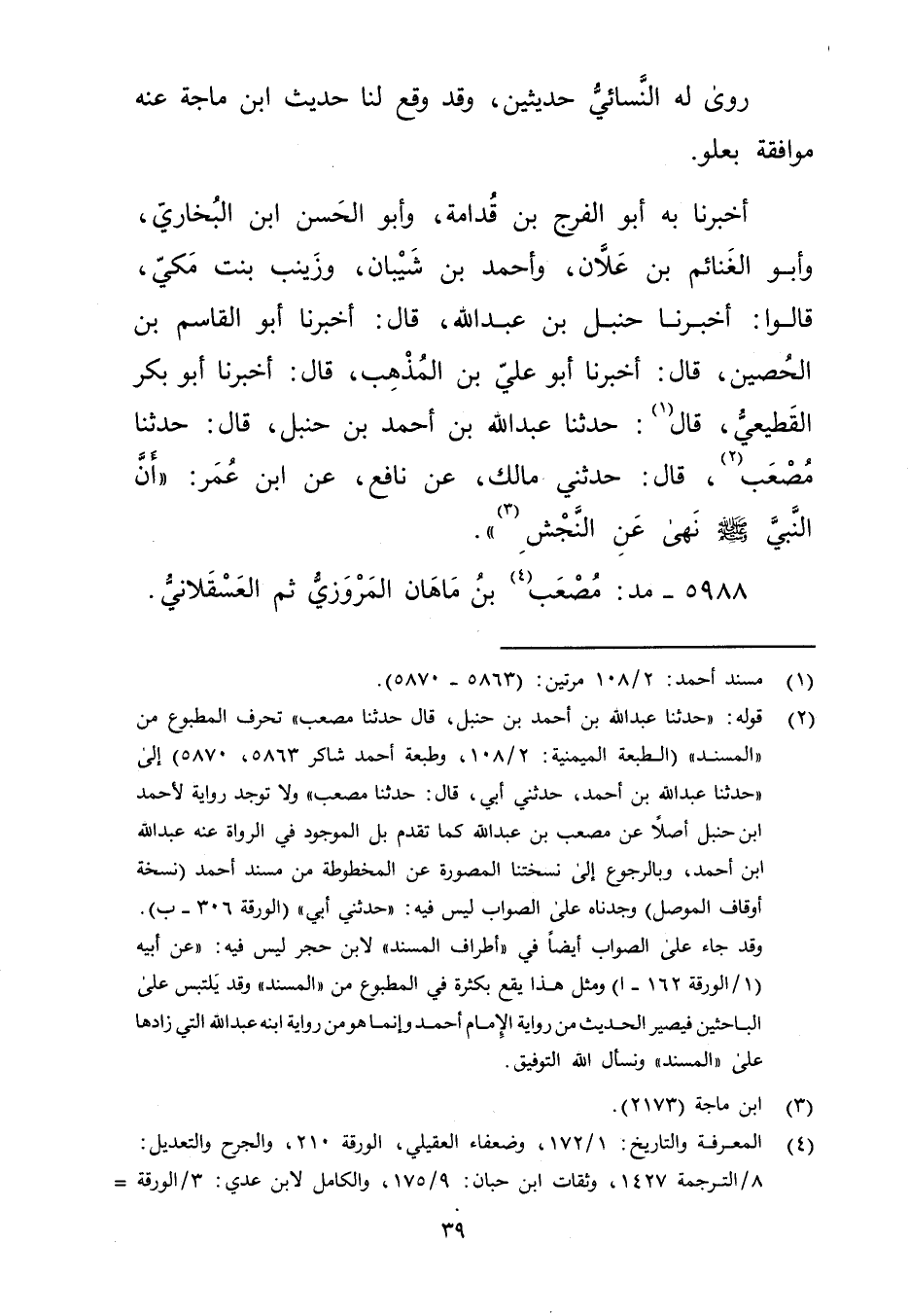 (2) قله: "حَدَّثَنَا عَبد اللَّهِ بْنُ أَحْمَدَ بْنِ حَنْبَلٍ، قال: حَدَّثَنَا مصعب "تحرف المطبوع من "المسند " (الطبعة الميمنية: 2 / 108، وطبعة أحمد شاكر 5863، 5870) إلى "حَدَّثَنَا عَبد اللَّهِ بْنُ أَحْمَدَ، حَدَّثني أبي، قال: حَدَّثَنَا مصعب "ولا توجد رواية لأحمد بن حنبل أصلا عَن مصعب بْن عَبد الله كما تقدم بل الموجود في الرواة عنه عَبد الله بن أحمد، وبالرجوع إلى نسختنا المصورة عن المخطوطة من مسند أحمد (نسخة أوقاف الموصف) وجدناه على الصواب ليس فيه: "حَدَّثني أبي " (الورقة 306 - ب) . وقد جاء على الصواب أيضا في "أطراف المسند "لابن حجر ليس فيه: "عَن أبيه (1 / الوربة 162 - 1) ومثل هذا يقع بكثرة في المطبوع من "المسند "وقد يلتبس على الباحثين فيصير الحديث من رواية الإمام أحمد وإنما هو من رواية ابنه عَبد الله التي زادها على "المسند "ونسأل الله التوفيق.