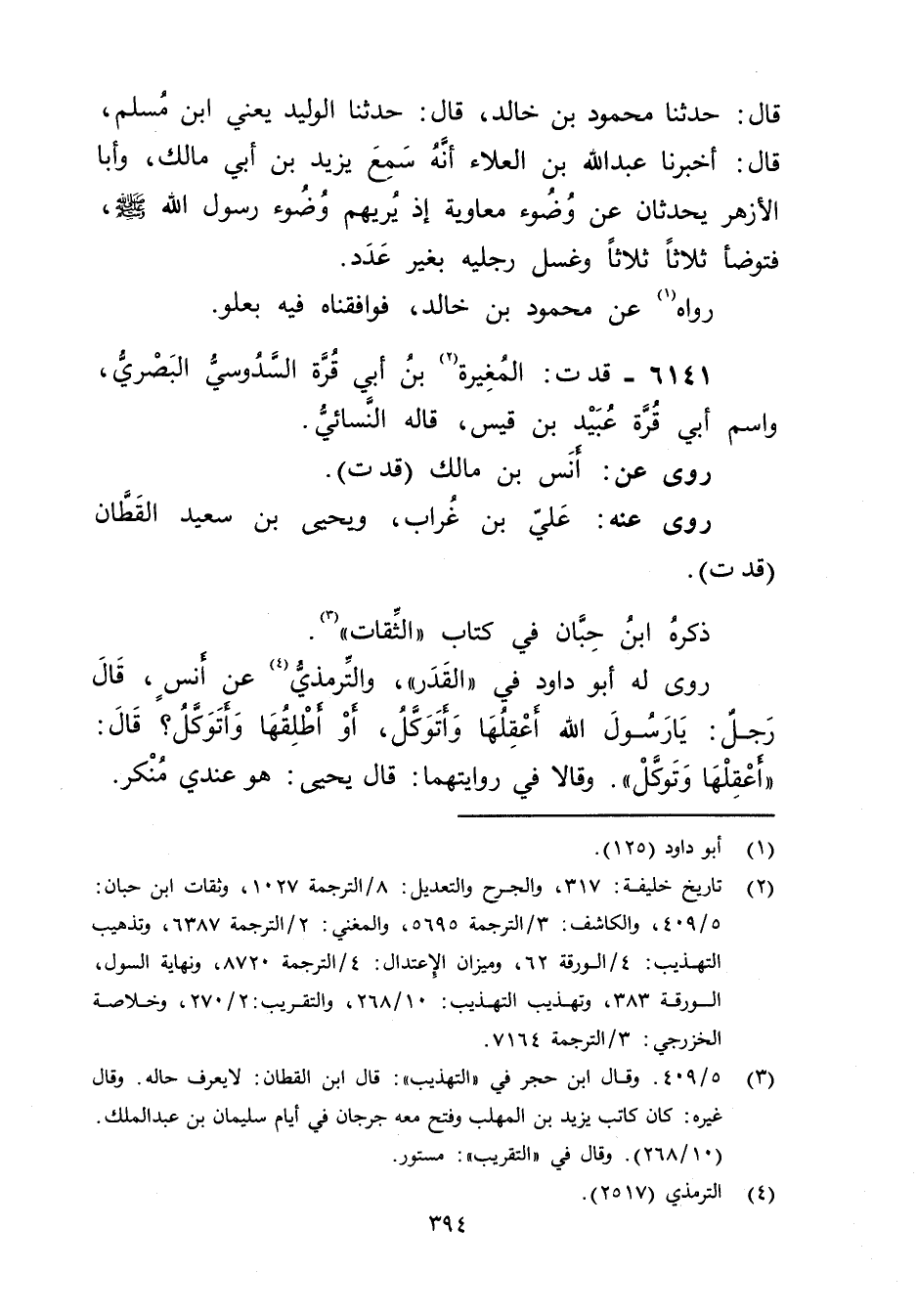 (2) تاريخ خليفة: 317، والجرح والتعديل: 8 / الترجمة 1027، وثقات ابن حبان: 5 / 409، والكاشف: 3 / الترجمة 5695، والمغني: 2 / الترجمة 6387، وتذهيب التهذيب: 4 / الورقة 62، وميزان الاعتدال: 4 / الترجمة 8720، ونهاية السول، الورقة 383، وتهذيب التهذيب: 10 / 268، والتقريب: 2 / 270، وخلاصة الخزرجي: 3 / الترجمة 7164.