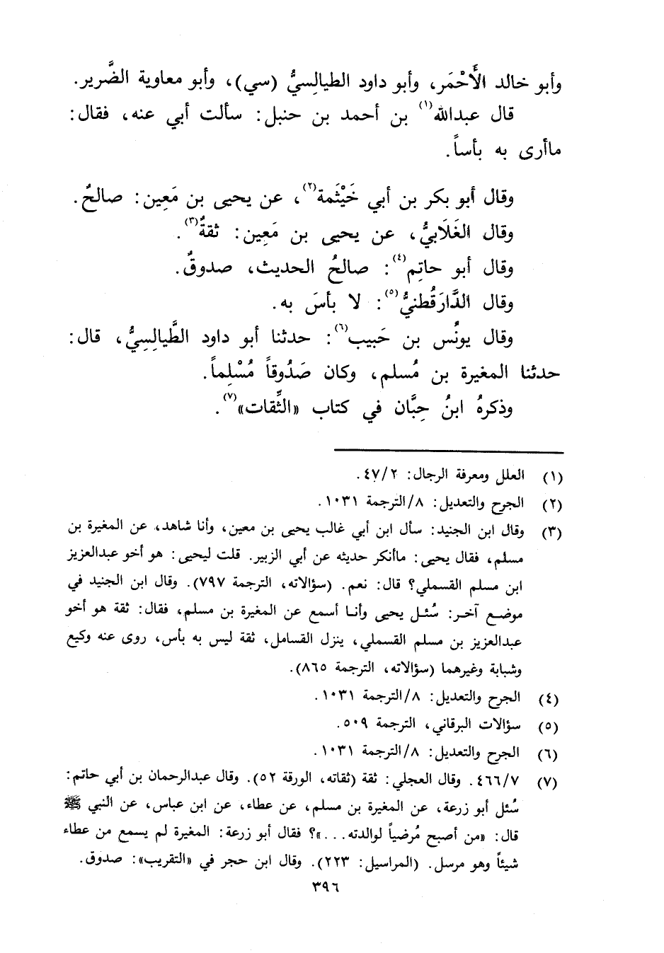 (3) وَقَال ابن الجنيد: سأل ابن أَبي غالب يحيى بن مَعِين، وأنا شاهد، عن المغيرة بن مسلم، فقال يحيى: ما أنكر حديثه عَن أبي الزبير. قلت ليحيى: هو أخو عبد العزيز ابن مسلم القسملي؟ قال: نعم. (سؤالاته، الترجمة 797) وَقَال ابن الجنيد فِي موضع آخر: سئل يَحْيَى وأنا أسمع عن المغيرة بن مسلم، فقال: ثقة هو أخو عَبْد العزيز بْن مسلم القسملي، ينزل القسامل، ثقة ليس بِهِ بأس، روى عنه وكيع وشبابة وغيرهما (سؤالاته، الترجمة 865) .