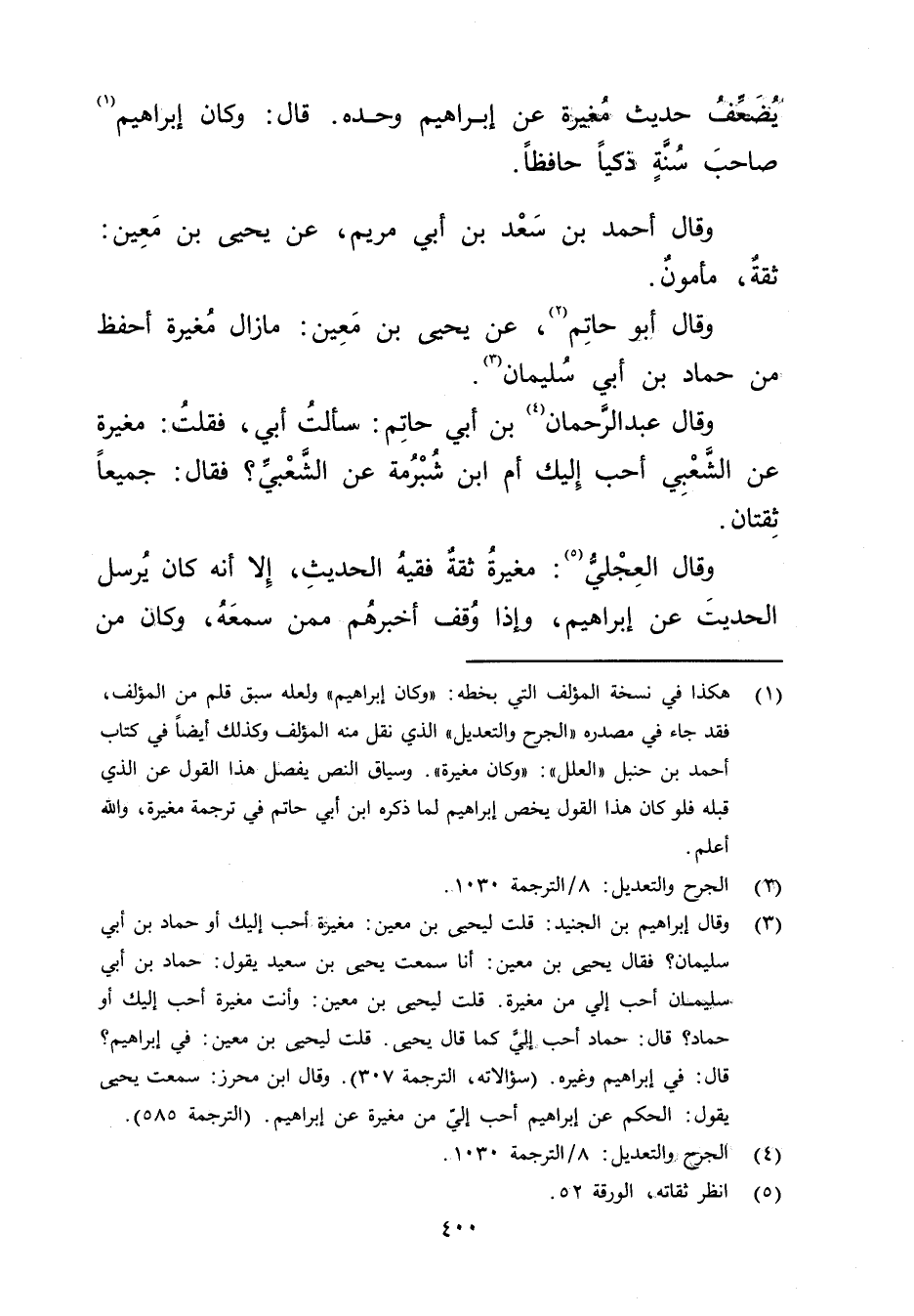 (1) هكذا في نسخة المؤلف التي بخطه" وكان إبراهيم" ولعله سبق قلم من المؤلف، فقد جاء في مصدره" الجرح والتعديل" الذي نقل منه المؤلف وكذلك أيضا في كتاب أحمد بن حنبل" العلل": وكان مغيرة". وسياق النص يفصل هذا القول عن الذي قبله فلو كان هذا القول يخص إبراهيم لما ذكره ابن أَبي حاتم في ترجمة مغيرة، والله أعلم.