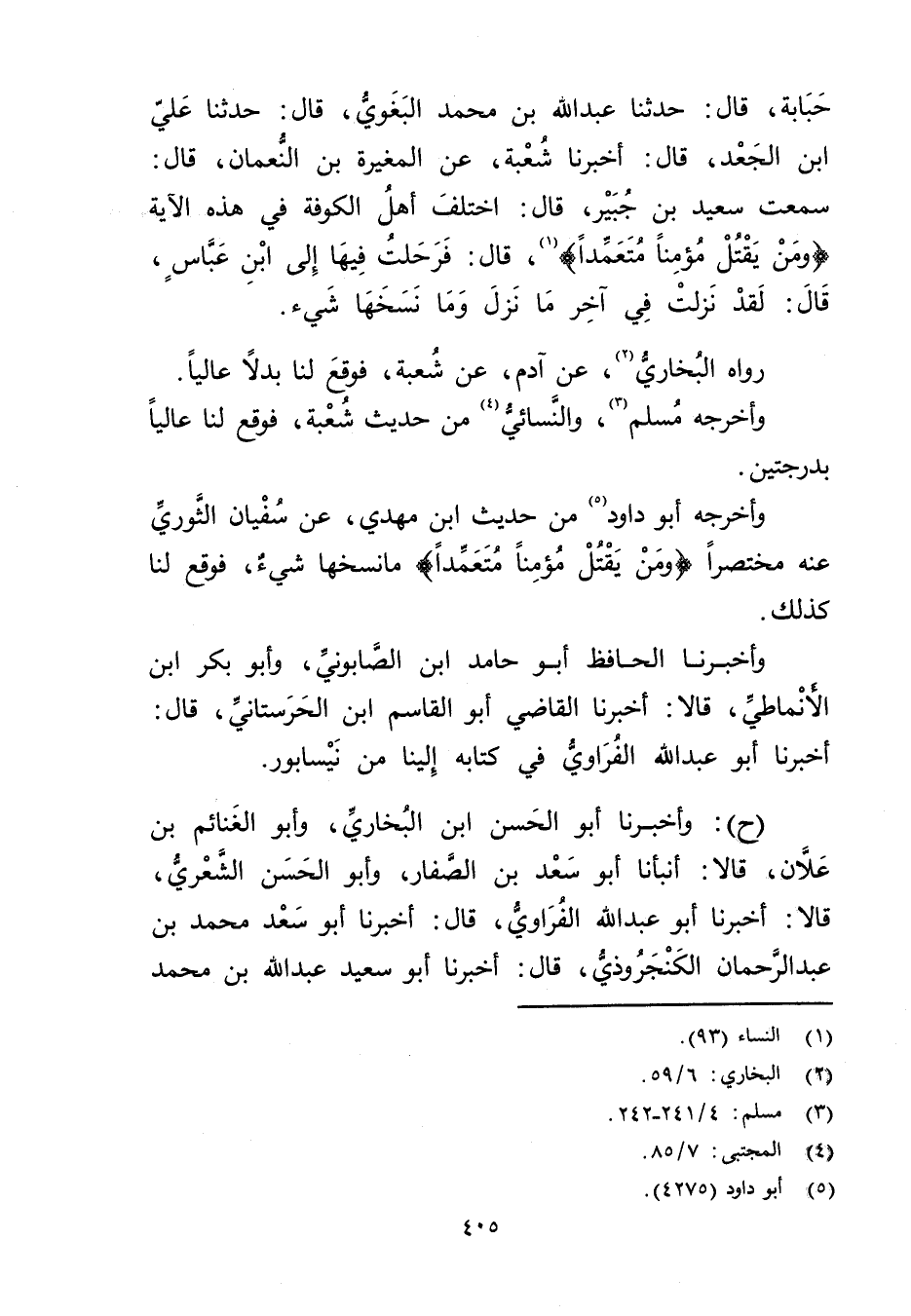 حُبَابَةَ، قال: حَدَّثَنَا عَبد اللَّهِ بْنُ مُحَمَّدٍ الْبَغَوِيُّ. قال: حَدَّثَنَا علي ابن الْجَعْدِ، قال: أَخْبَرَنَا شُعْبَةُ، عَنْ الْمُغِيرَةِ بْنِ النُّعْمَانِ، قال: سَمِعْتُ سَعِيد بْنَ جُبَيْرٍ، قال: اخْتَلَفَ أَهْلُ الْكُوفَةِ فِي هَذِهِ الآيَةِ (ومَنْ يَقْتُلْ مُؤْمِنًا مُتَعَمِّدًا) (1) قال: فَرَحَلْتُ فِيهَا إِلَى ابْنِ عَبَّاسٍ، قال: لَقَدْ نَزَلْتَ فِي آخِرِ ما نزل وما نسخها شئ.