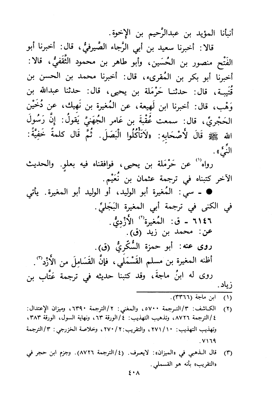 قَالا: أخبرنا سَعِيد بْنُ أَبي الرَّجَاءِ الصَّيْرَفِيُّ، قال: أخبرنا أَبُو الْفَتْحِ مَنْصُورُ بْنُ الْحُسَيْنِ، وأَبُو طَاهِرِ بْنُ مَحْمَودٍ الثَّقَفِيُّ، قَالا: أخبرنا أَبُو بَكْرِ بْن المقرئ، قال: أَخْبَرَنَا مُحَمَّد بْنُ الْحَسَنِ بْنِ قُتَيْبَةَ، قال: حَدَّثَنَا حَرْمَلَةُ بْنُ يَحْيَى، قال: حَدَّثَنَا عَبد اللَّهِ بْن وهب، قال: أَخْبَرَنَا ابْنُ لَهِيعَة، عَنْ الْمُغِيرَةِ بْنِ نَهِيكٍ، عَنْ دُخَيْنٍ الْحَجَرِيِّ، قال: سَمِعْتُ عُقْبَةَ بْنَ عَامِرٍ الْجُهَنِيَّ يَقُولُ: إِنَّ رَسُولَ اللَّهِ صلى الله عليه وسلم قال لأَصْحَابِهِ: لا تَأْكُلُوا الْبَصَلَ.