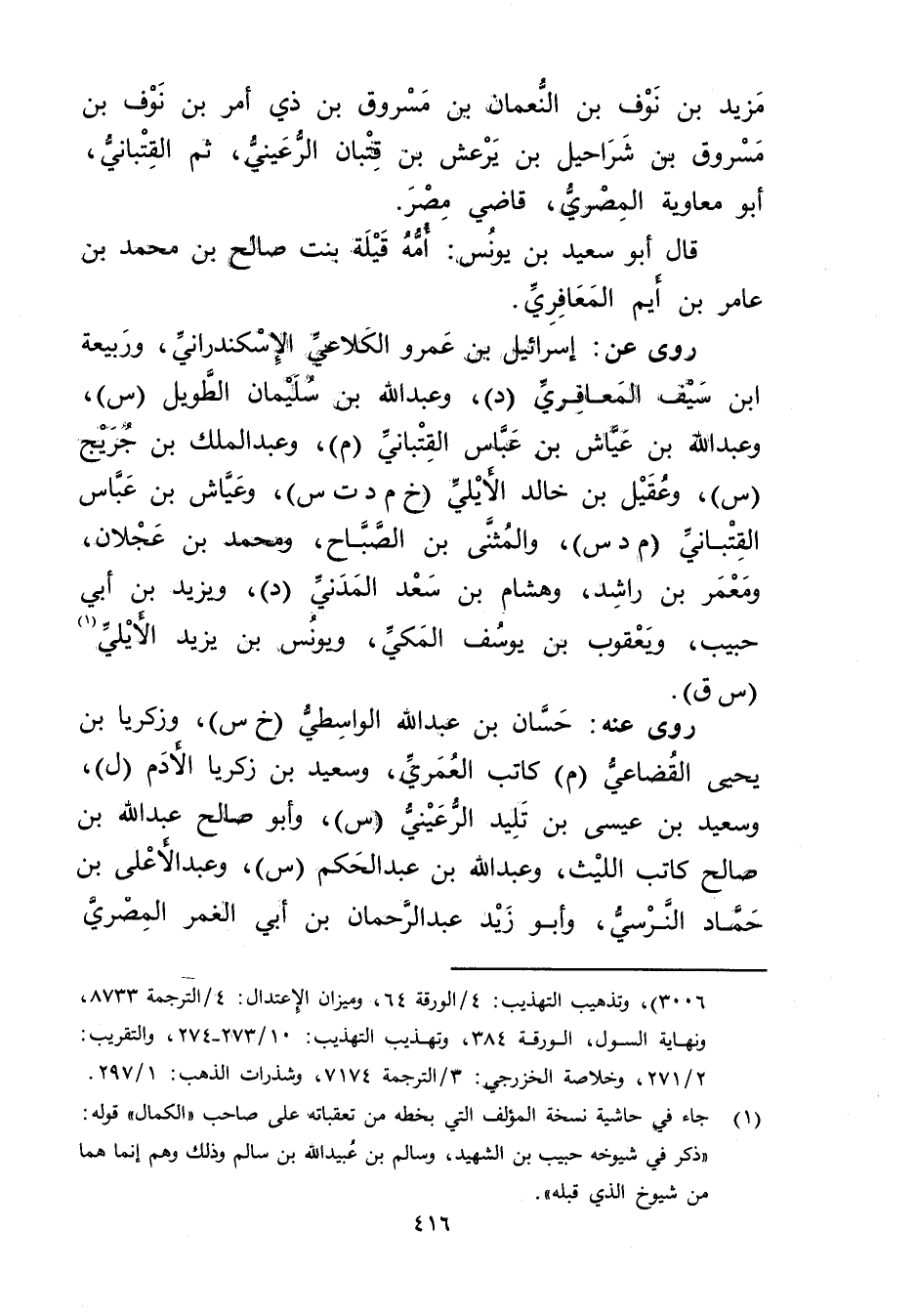 3006) وتذهيب التهذيب: 4 / الورقة 64، وميزان الاعتدال: 4 / الترجمة 8733 ونهاية السول، الورقة 384، وتهذيب التهذيب: 10 / 273 - 274، والتقريب: 2 / 271، وخلاصة الخزرجي: 3 / الترجمة 7174، وشذرات الذهب: 1 / 297 (1) جاء في حاشية نسخة المؤلف التي بخطه من تعقباته على صاحب" الكمال" قوله: ذكر في شيوخه حبيب بن الشهيد، وسالم بْن عُبَيد اللَّهِ بْن سالم وذلك وهم إنما هما من شيوخ الذي قبله"