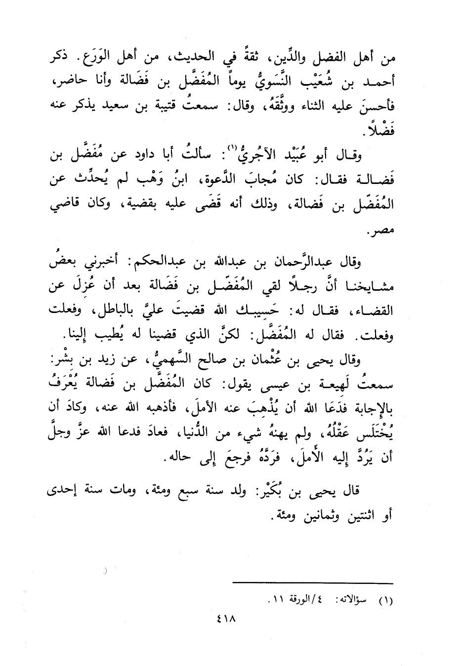 وَقَال أَبُو عُبَيد الآجري (1) : سألت أَبَا داود عَن مفضل بْن فضالة فقال: كَانَ مجاب الدعوة، ابْن وهب لم يحدث عَن المفضل بْن فضالة، وذلك أنه قضى عليه بقضية، وكان قاضي مصر.