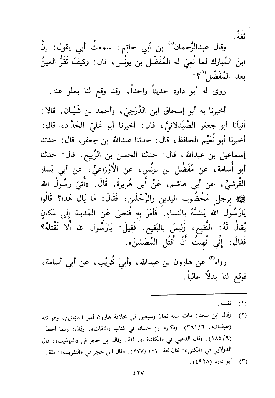 أَخْبَرَنَا بِهِ أَبُو إِسْحَاقَ ابْنُ الدَّرَجِيِّ، وأَحْمَدُ بْنُ شَيْبَانَ قالا: أَنْبَأَنَا أَبُو جَعْفَرٍ الصَّيْدَلانِيُّ، قال: أَخْبَرَنَا أَبُو عَلِيّ الحداد قال: أَخْبَرَنَا أَبُو نعيم الحافظ، قال: حَدَّثَنَا عَبد الله بْن جعفر قال: حَدَّثَنَا إسماعيل بْن عَبد اللَّهِ، قال: حَدَّثَنَا الْحَسَنُ بْنُ الرَّبِيعِ، قال: حَدَّثَنَا أَبُو أسامة، عن مُفَضَّلِ بْنِ يُونُسَ، عَنِ الأَوزاعِيّ، عَن أَبِي يَسَارٍ الْقُرَشِيِّ، عَن أَبِي هَاشِمٍ، عَن أَبِي هُرَيْرة، قال: أُتِيَ رَسُولُ اللَّهِ صَلَّى اللَّهُ عَلَيْهِ وسَلَّمَ بِرَجُلٍ مَخْضُوبَ الْيَدَيْنِ والرِّجْلَيْنِ، فَقَالَ: مَا بَالُ هَذَا؟ قَالُوا يَا رَسُولَ اللَّهِ يَتَشَبَّهُ بِالنِّسَاءِ فَأَمَرَ بِهِ فَنُحِّيَ عَنِ الْمَدِينَةِ إِلَى مَكَانٍ يُقَالُ لَهُ: النَّقِيعُ ولَيْسَ بِالْبَقِيعِ، فَقِيلَ: يارسول اللَّهِ أَلا نَقْتُلُهُ؟ فَقَالَ: إِنِّي نُهِيتُ أَنْ أَقْتُلَ الْمُصَلِّينَ".