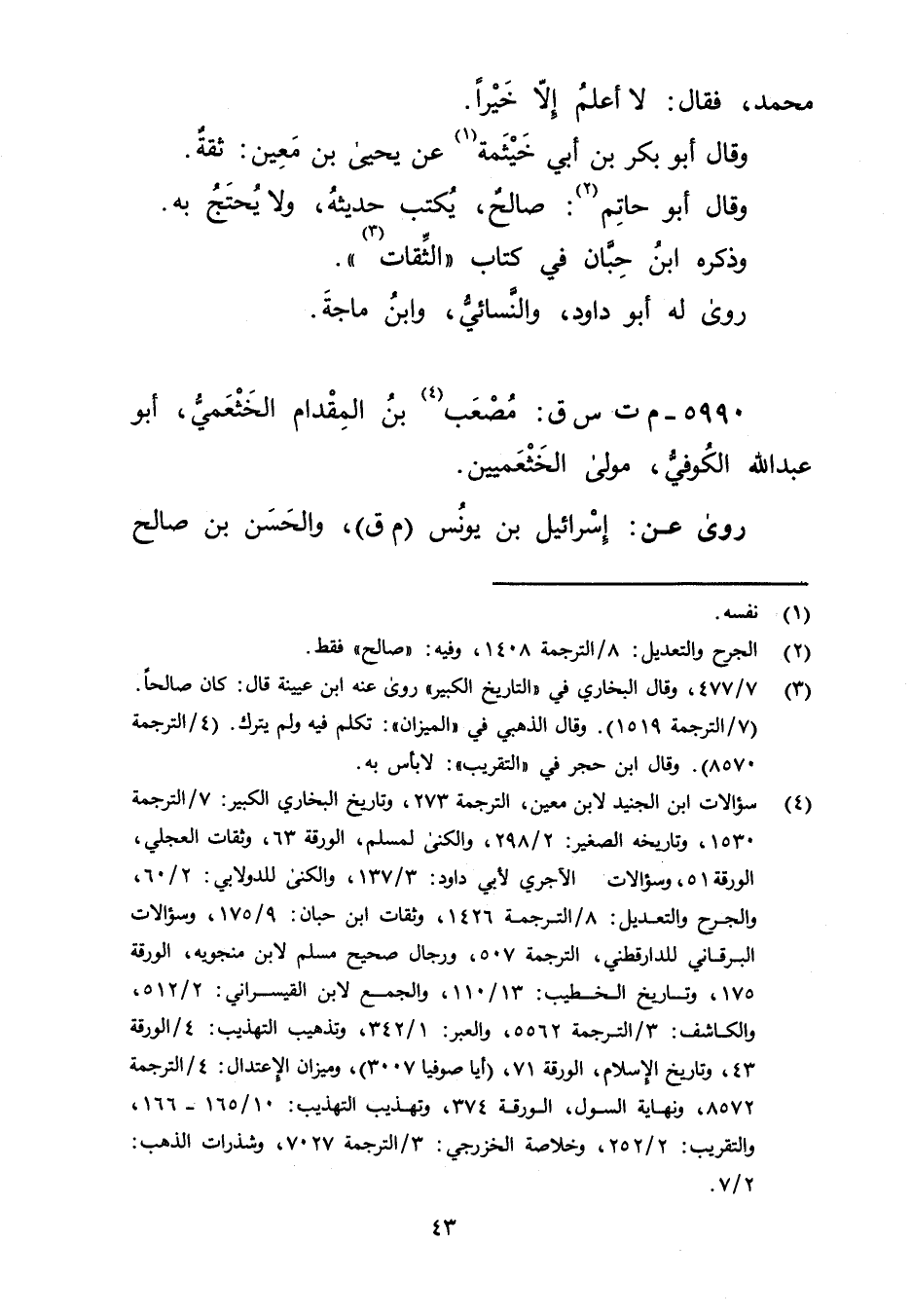 (4) سؤلات ابن الجنيد لابن معين , الترجمة 273 , وتاريخ البخاري الكبير: 7 / الترجمة 1530 وتاريخه الصغير: 2 / 298 والكنى لمسلم، الورقة 63 وثقات العجلي الورقة 51 وسؤالات الآجري لابي داود: 3 / 137، والكنى للدولابي: 2 / 60 والجرح والتعديل: 8 / الترجمة 1426، وثقات ابن حبان: 9 / 175، وسؤالات البرقاني للدارقطني، الترجمة 507، ورجال صحيح مسلم لابن منجويه، الورقة 175، وتاريخ الخطيب: 13 / 110، والجمع لابن القيسراني: 2 / 512 والكاشف: 3 / الترجمة 5562، والعبر: 1 / 342 وتذهيب التهذيب: 4 / الورقة 43، وتاريخ الاسلام، الورقة 71 (أيا صوفيا 3007) وميزان الاعتدال: 4 / الترجمة 8572، ونهاية السول، الورقة 374، وتهذيب التهذيب: 10 / 165 - 166، والتقريب: 2 / 252، وخلاصة الخزرجي: 3 / الترجمة 7027، وشذرات الذهب: 2 / 7