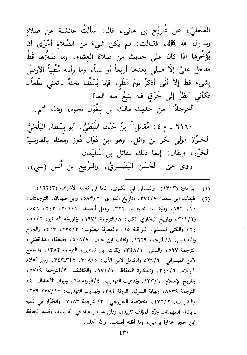 6160 - م 4: مُقَاتِلُ بن حَيَّانَ النِّبْطِيّ (2) ، أَبُو بسطام البلخي الخراز مولى بكر بْن وائل، وهو ابن دوال روز ومعناه بالفارسية الحراز، ويُقال: إنما ذلك مقاتل بْن سُلَيْمان.