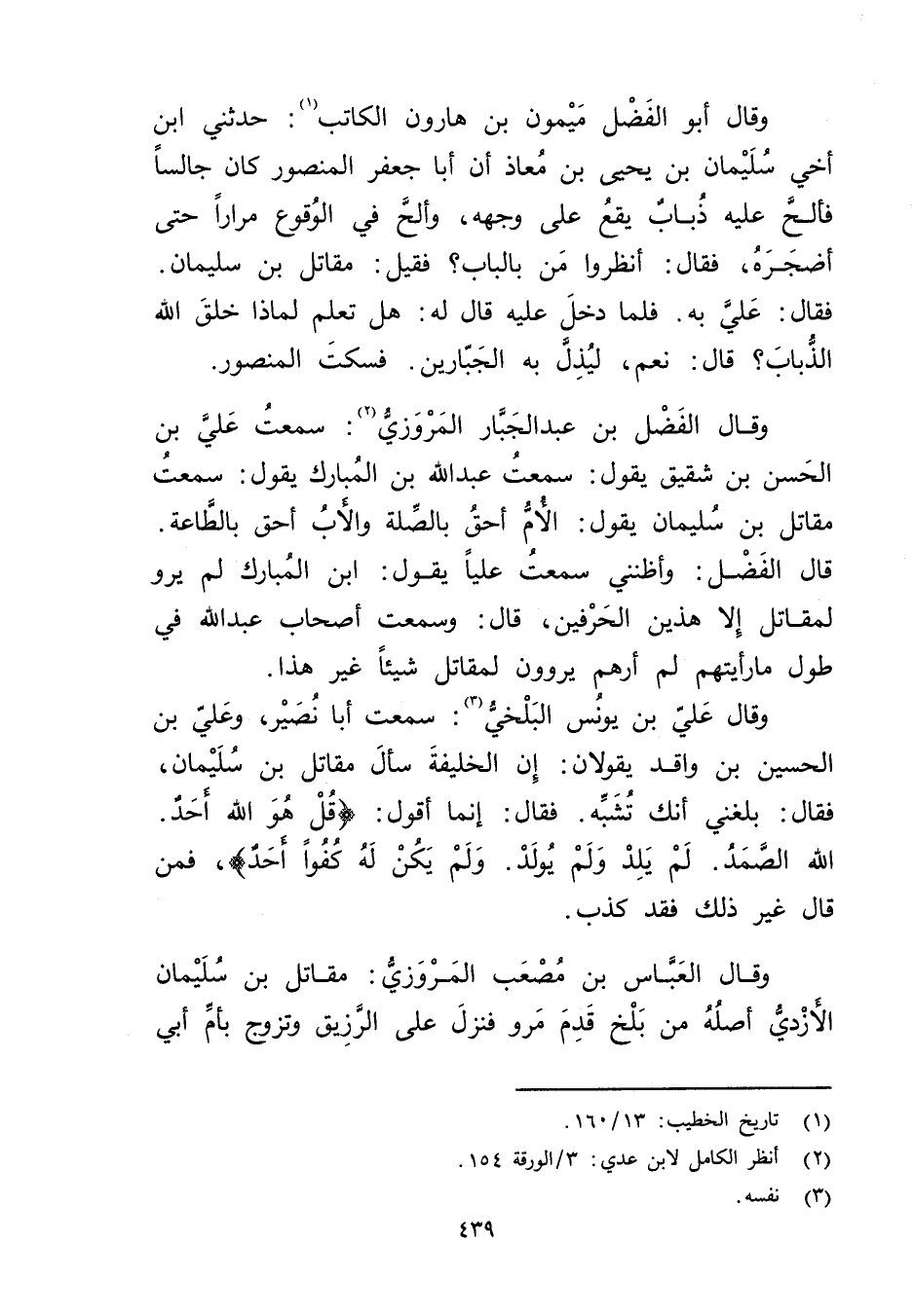 وَقَال علي بْن يونس البلخي (3) : سمعت أَبَا نصير، وعلي بْن الحسين بْن واقد يقولان: إن الخليفة سأل مقاتل بْن سُلَيْمان، فقال: بلغني أنك تشبه. فقال: إنما أقول: (قل هو اللَّه أحد.