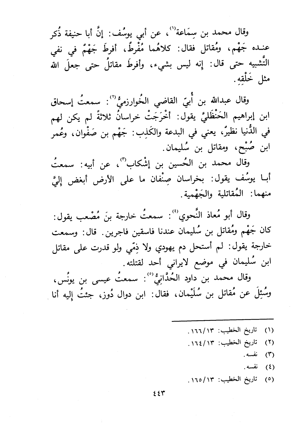 وَقَال مُحَمَّد بْن سماعة (1) ، عَن أَبِي يوسف: إن أَبَا حنيفة ذكر عنده جهم، ومقاتل فقال: كلاهما مفرط، أفرط جهم فِي نفي التشبيه حتى قال: إنه ليس بشيءٍ، وأفرط مقاتل حتى جعل اللَّهِ مثل خلقه.
