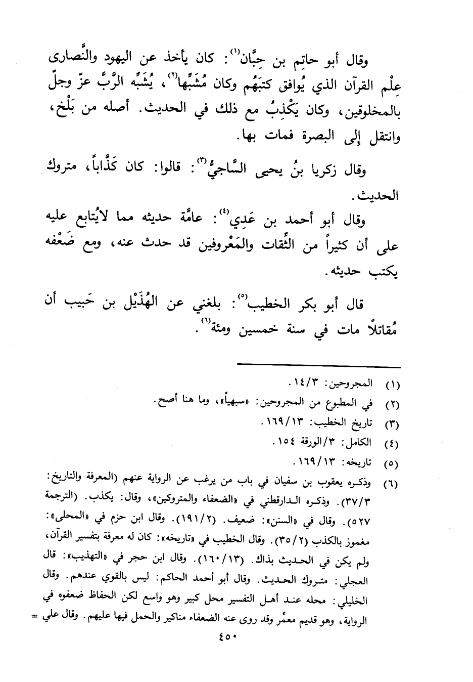 وَقَال أَبُو حَاتِم بْن حبان (1) : كَانَ يأخذ عَن اليهود والنصارى علم القرآن الذي يوافق كتبهم وكان مشبها (2) ، يشبه الرب عزوجل بالمخلوقين، وكان يكذب مع ذلك فِي الحديث. أصله من بلخ، وانتقل إِلَى البصرة فمات بها.