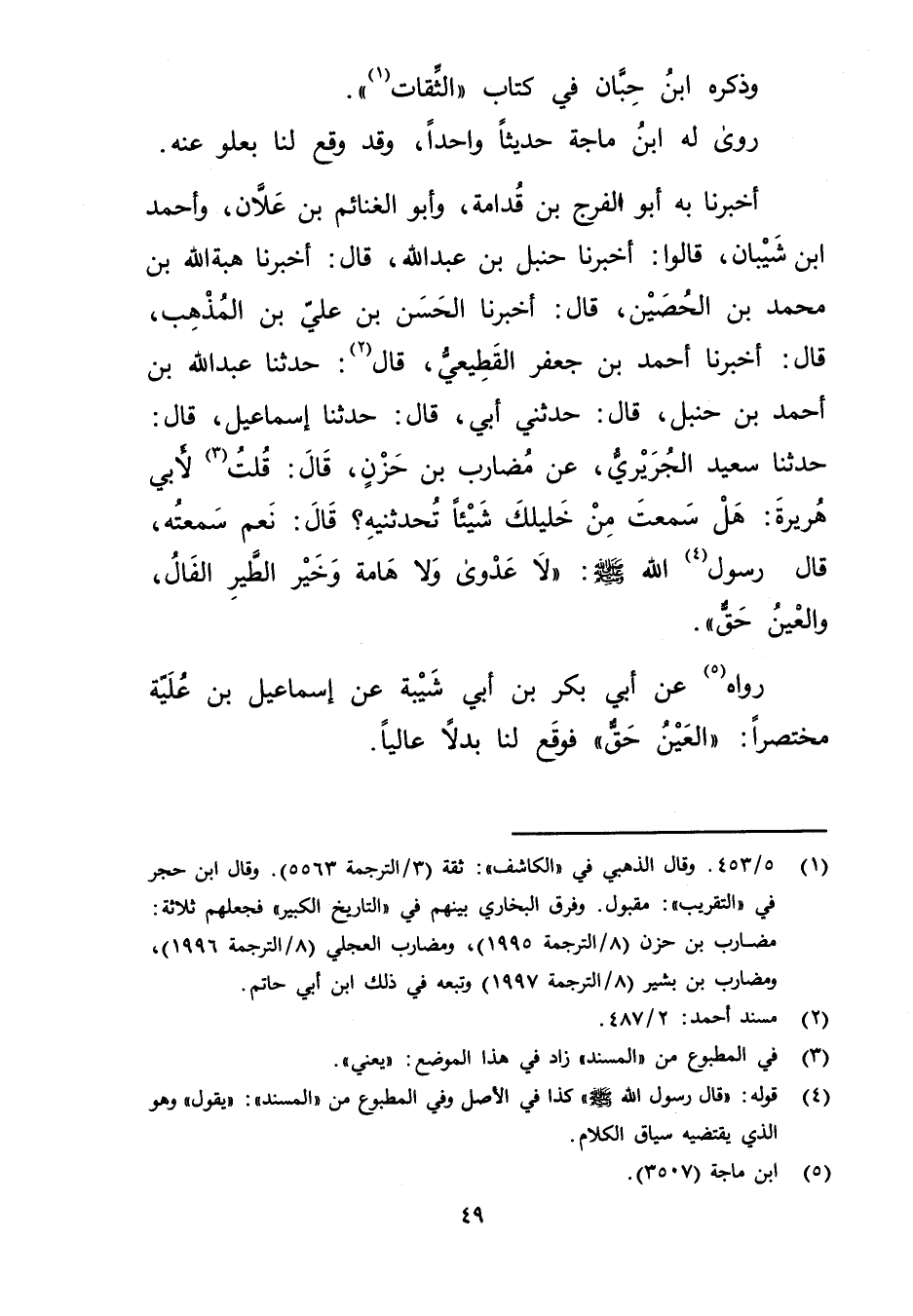 روى لِهِ ابن مَاجَهْ حديثا واحدا وقد وقع لنا بعلو عنه أَخْبَرَنَا بِهِ أَبُو الْفَرَجِ بْنُ قُدَامَةَ، وأَبُو الْغَنَائِمِ بْن علان، وأحمد بْن شيبان قالوا: أَخْبَرَنَا حنبل بْن عَبد اللَّهِ، قال: أَخْبَرَنَا هِبَةُ اللَّهِ بْن مُحَمَّد بْن الحصين قال: أَخْبَرَنَا الْحَسَنُ بْنُ عَلِيِّ بْنِ الْمُذْهِبِ قال: أَخْبَرَنَا أَحْمَدُ بْنُ جَعْفَرٍ القَطِيعِيّ، قال (2) : حَدَّثَنَا عَبد اللَّهِ بْن أَحْمَد بْن حنبل قال: حَدَّثني أبي قال: حَدَّثَنَا إِسْمَاعِيلُ، قال: حَدَّثَنَا سَعِيد الْجُرَيْرِيِّ، عَنْ مُضَارِبِ بْنِ حَزْنٍ، قال: قُلْتُ (3) لأَبِي هُرَيْرة: هَلْ سَمِعْتَ مِنْ خَلِيلِكَ شَيْئًا تُحَدِّثَنِيهِ؟ قال: نَعَمْ سَمِعْتُهُ قال رَسُولُ (4) اللَّهِ صلى الله عليه وسلم: "لا عَدْوَى ولا هَامَةَ وخَيْرُ الطَّيْرِ الْفَالُ والْعَيْنُ حَقٌّ.