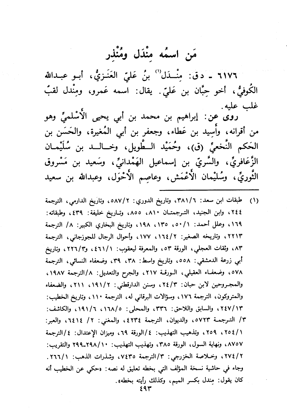 6176 - د ق: مندل بن علي العنزي (1) ، أَبُو عَبْد اللَّهِ الكوفي، أخو حبان بْن علي، يقال: اسمه عَمْرو، ومندل لقب غلب عليه.