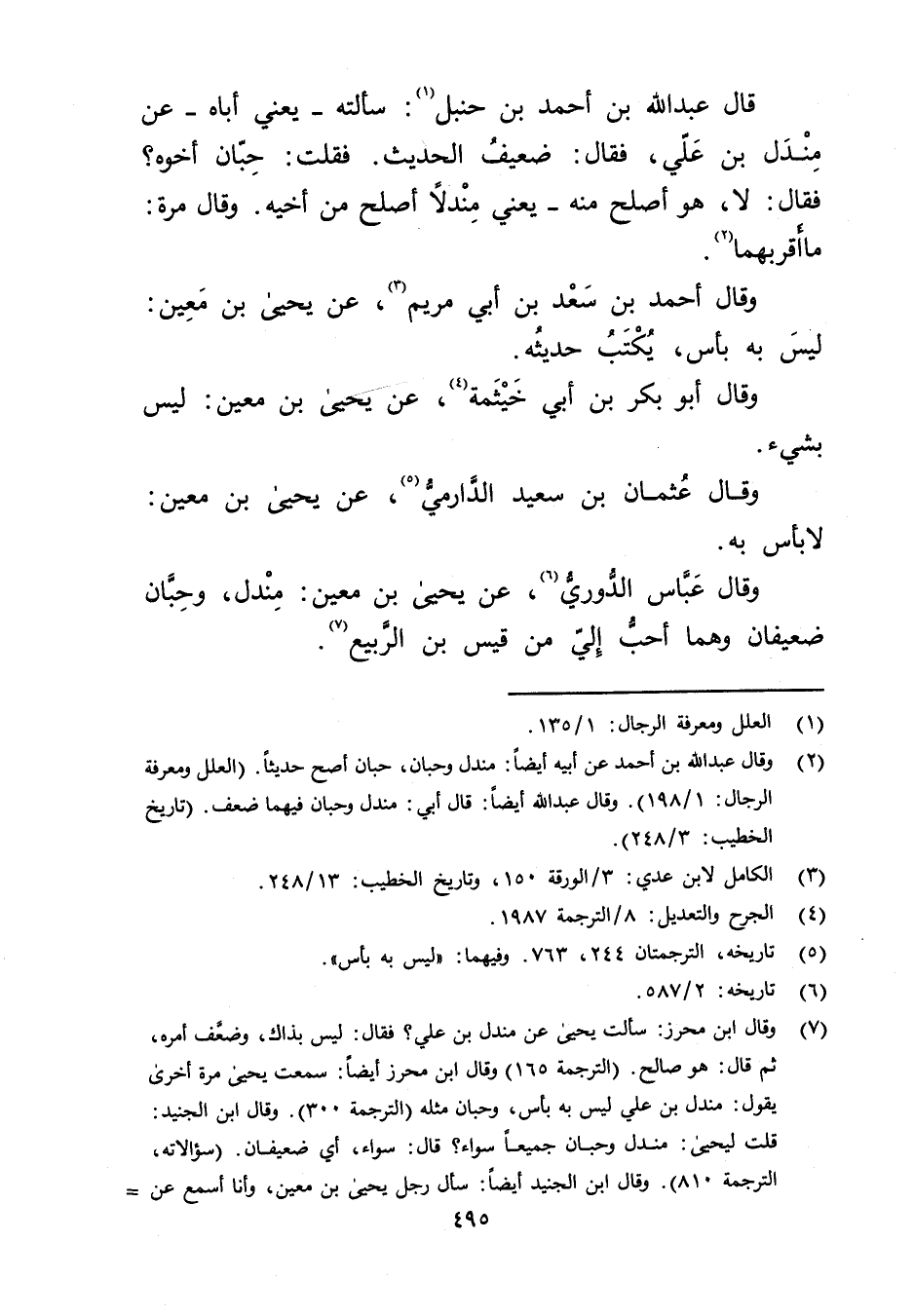 (2) وَقَال عباس بن أحمد عَن أبيه أيضا: مندل وحبان، حبان أصح حديثًا. (العلل ومعرفة الرجال: 1 / 198) وَقَال عَبد الله أيضا: قال أبي: مندل وحبان فيهما ضعف. (تاريخ الخطيب: 3 / 248) .