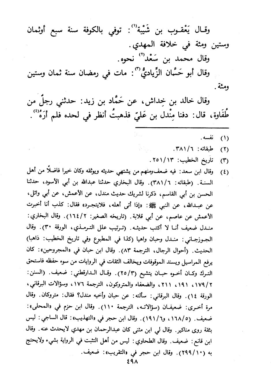 (4) وَقَال ابن سعد: فيه ضعيف ومنهم من يشتهي حديث ويوثقه وكان خيرا فاضلا من أهل السنة. (طبقاته: 6 / 381) وقَال البُخارِيُّ حَدَّثَنَا عَبد اللَّهِ بن أَبي الأسود , حَدَّثَنَا الحسن بن أَبي القاسم , ذكرنا لشَرِيك حديث مندل، عن الأعمش , عَن أبي وائل، عن عَبد الله، عن النبي صلى الله عليه وسلم" إذا أتى أهله، فلا يتجرد" فقال: كذب أنا أخبرت الأعمش عن عاصم، عَن أبي قلابة: (تاريخه الصغير: 2 / 164) وقَال البُخارِيُّ: مندل ضعيف أنا لا أكتب حديثه (ترتيب علل التِّرْمِذِيّ، الورقة 30) وَقَال الجوزجاني: مندل وحبان واهيا (كذا في المطبوع وفي تاريخ الخطيب: ذاهبا) الحديث (أحوال الرجال، الترجمة 83) وَقَال ابن حبان في " المجروحين": كان يرفع المراسيل ويسند الموقوفات ويخالف الثقات في الروايات من سوء حفظه فاستحق الترك وكان أخوه حبان يتشيع (3 / 25) . وَقَال الدَّارَقُطنِيّ: ضعيف (السنن: 2 / 179، 191، 211، والضعفاء والمتروكون، الترجمة 176، وسؤالات البرقاني، الورقة 14) وَقَال البرقاني: سألته: عن حبان وأخيه مندل؟ فقال: متروكان، وَقَال مرة أخرى: ضعيفان (سؤالاته، الترجمة 110) وَقَال ابن حزم في " المحلى": ضعيف. (5 / 168، و6 / 191) وَقَال ابن حجر في " التهذيب": قال الساجي: ليس بثقة روى مناكير. وقا للي ابن مثنى كان عبد الرحمن بن مهدي لا يحدث عنه. وَقَال ابن قانع: ضعيف. وَقَال الطحاوي: ليس من أهل التثبت في الرواية بشيءٍ ولا يحتج به (10 / 299) وَقَال ابن حجر في "التقريب": ضعيف.