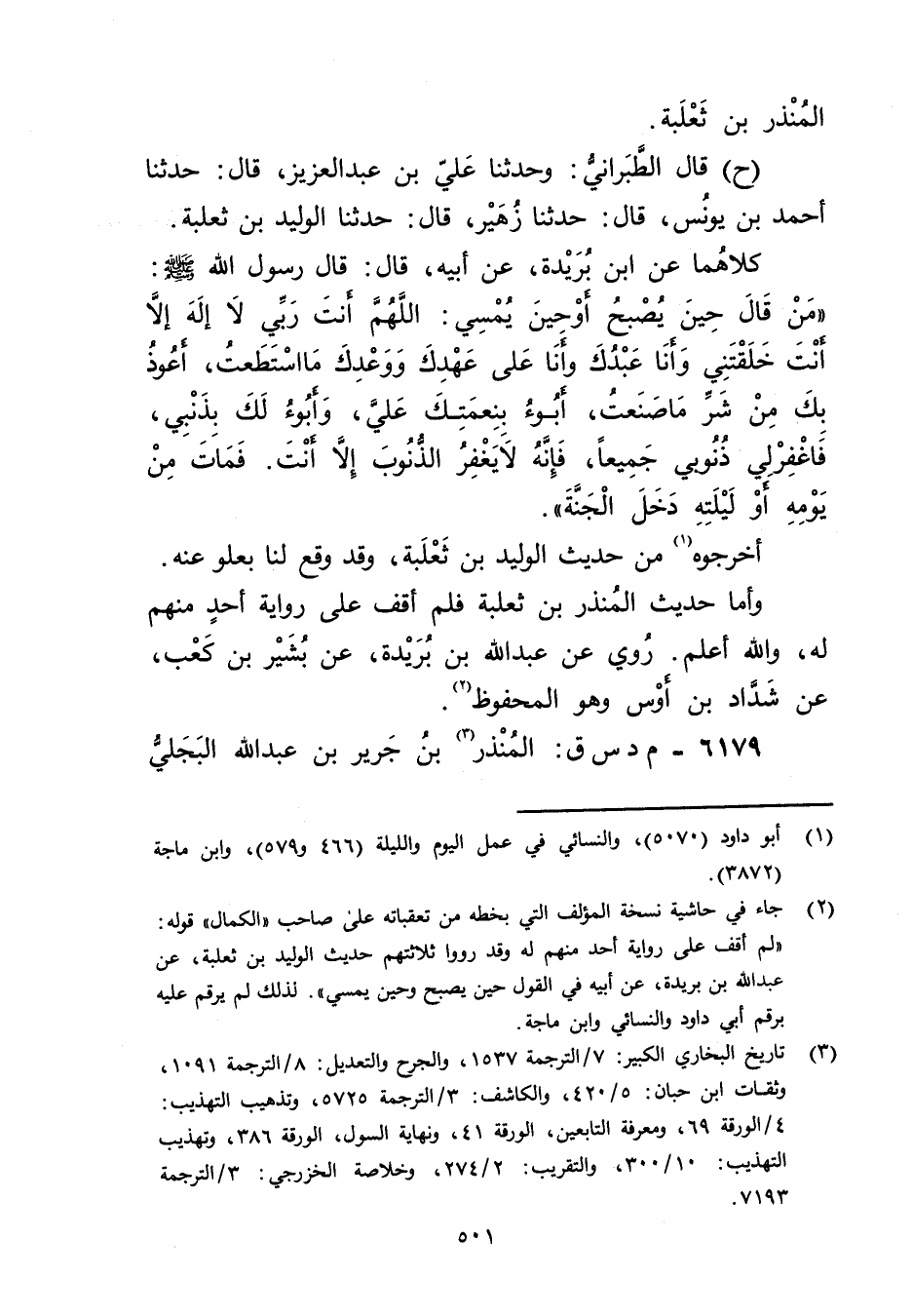 وأَما حديث المنذر بْن ثعلبة فلم أقف على رواية أحد منهم لَهُ، والله أعلم. روى عَنْ عَبد اللَّهِ بْن بريدة، عَن بشير بْن كعب، عَن شداد بْن أوس وهو المحفوظ (2) .