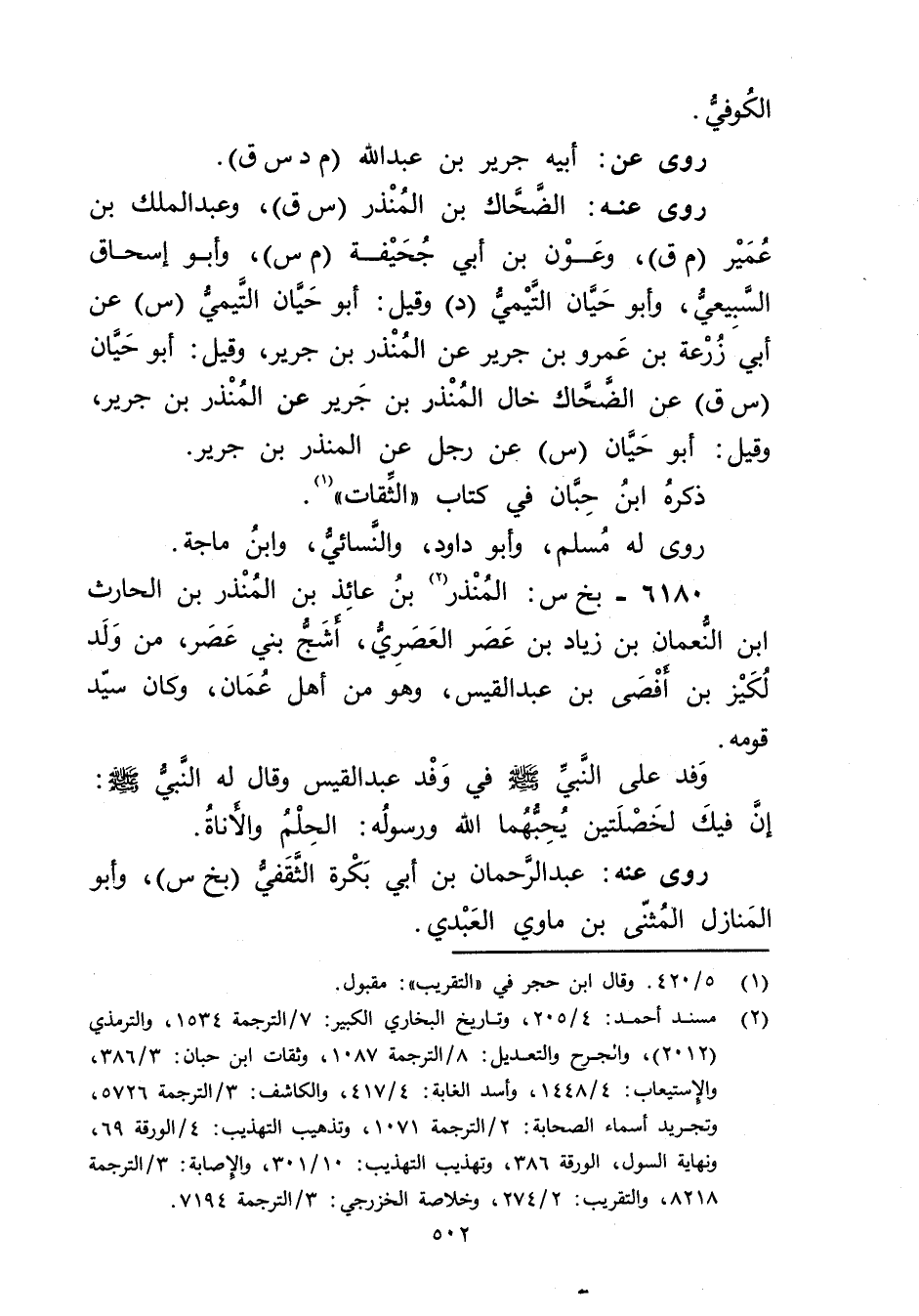 عَن أبي زرعة بْن عَمْرو بْن جرير عن المنذر بن جرير، وقيل: أَبُو حيان (س ق) ، عن الضحاك خال المنذر بن جرير عن المنذر بن جرير، وقيل: أَبُو حيان (س) ، عَن رجل عن المنذر بن جرير.