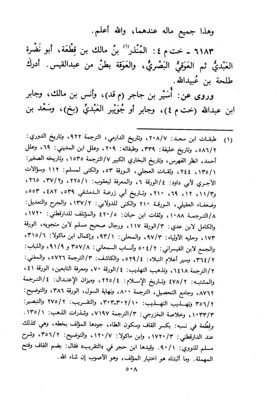 6183 - خت م 4: المنذر بْن مالك بْن قطعة (1) ، أَبُو نضرة العبدي ثم العوقي البَصْرِيّ، والعرقة بطن من عبد القيس، أدرك طلحة بْن عُبَيد اللَّهِ.
