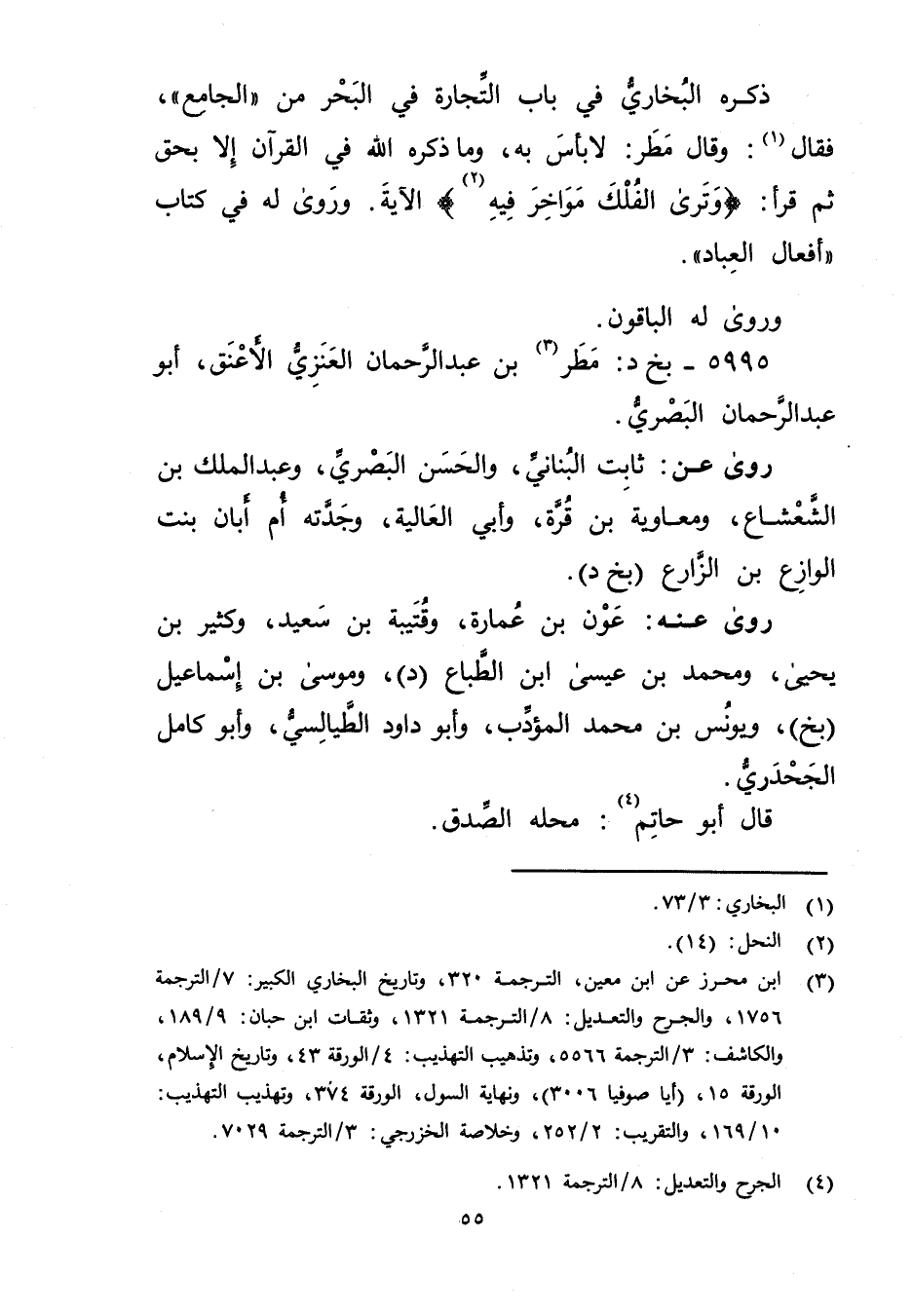 (1) البخاري: 3 / 73 (2) النحل: (14) (3) ابن محرز عن ابن مَعِين، الترجمة 320 وتاريخ البخاري الكبير: 7 / الترجمة 1756، والجرح والتعديل: 8 / الترجمة 1321، وثقات ابن حبان: 9 / 189 والكاشف: 3 / الترجمة 5566، وتذهيب التهذيب: 4 / الورقة 43، وتاريخ الاسلام الورقة 15 (أيا صوفيا 3006) ونهاية السول، الورقة 374، وتهذيب التهذيب: 10 / 169، والتقريب: 2 / 252، وخلاصة الخزرجي: 3 / الترجمة 7029 (4) الجرح والتعديل: 8 / الترجمة 1321