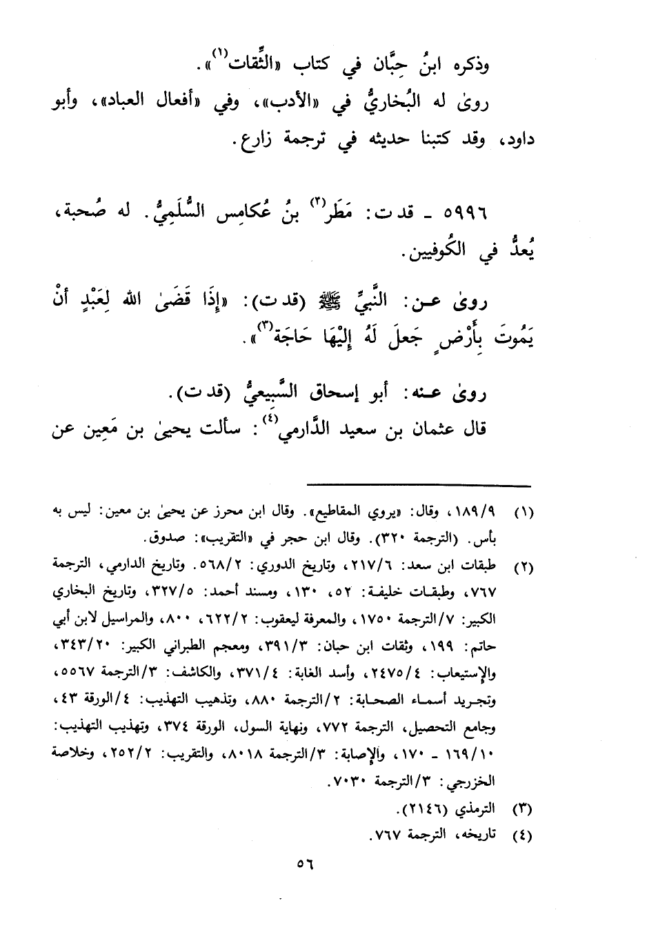 (2) طبقات ابن سعد: 6 / 217، وتاريخ الدوري: 2 / 568، وتاريخ الدارمي الترجمة 767، وطبقات خليفة: 52، 130، ومسند أحمد: 5 / 327، وتاريخ البخاري الكبير: 7 / الترجمة 1750، والمعرفة ليعقوب: 2 / 622، 800، والمراسيل لابن أَبي حاتم: 199، وثقات ابن حبان: 3 / 391، ومعجم الطبرائي الكبير: 20 / 343 والاستيعاب: 4 / 2475، وأسد الغابة: 4 / 371، والكاشف: 3 / الترجمة 5567 وتجريد أسماء الصحابة: 2 / الترجمة 880، وتذهيب التهذيب: 4 / الورقة 43 وجامع التحصيل، الترجمة 772، ونهاية السول، الورقة 374، وتهذيب التهذيب: 10 / 169 - 170 والاصابة: 3 / الترجمة 8018، والتقريب: 2 / 252، وخلاصة الخزرجي: 3 / الترجمة 7030