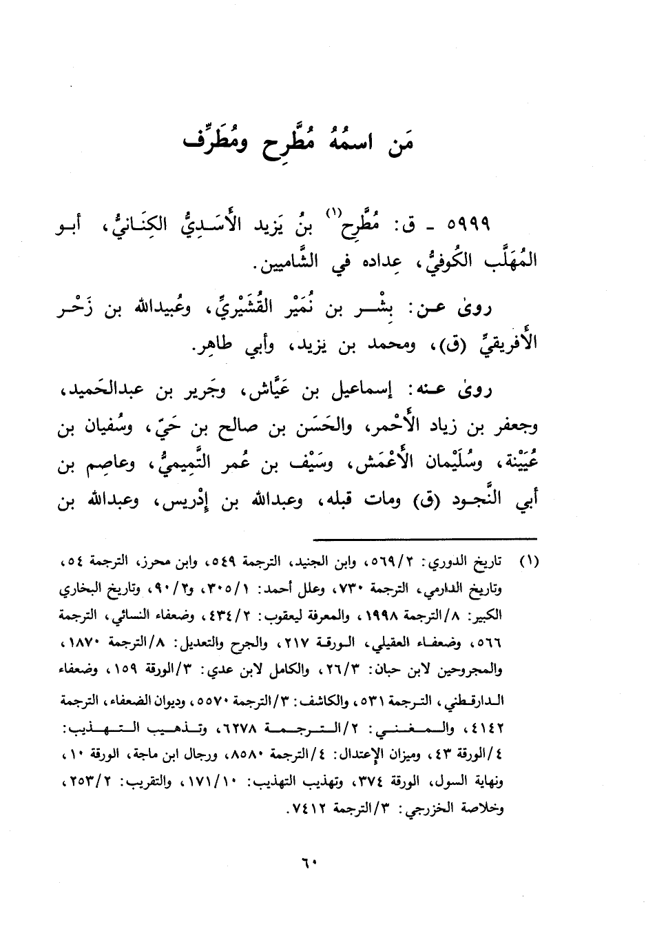 5999 - ق: مطرح بن يزيد الأسدي الكناني (1) ، أَبُو المهلب الكوفي، عداده فِي الشاميين رَوَى عَن: بشر بْن نمير القشيري وعُبَيد اللَّهِ بْن زحر الإفْرِيقيّ (ق) ومحمد بْن يزيد، وأبي طاهر رَوَى عَنه: إسماعيل بْن عياش، وجرير بْن عبد الحميد وجعفر بْن زياد الأحمر والحسن بْن صَالِح بْن حي وسفيان بْن عُيَيْنَة، وسُلَيْمان الأعمش، وسيف بْن عُمَر التميمي وعاصم بْن أَبي النجود (ق) ومات قبله، وعَبد الله بْن إدريس، وعَبد الله بْن