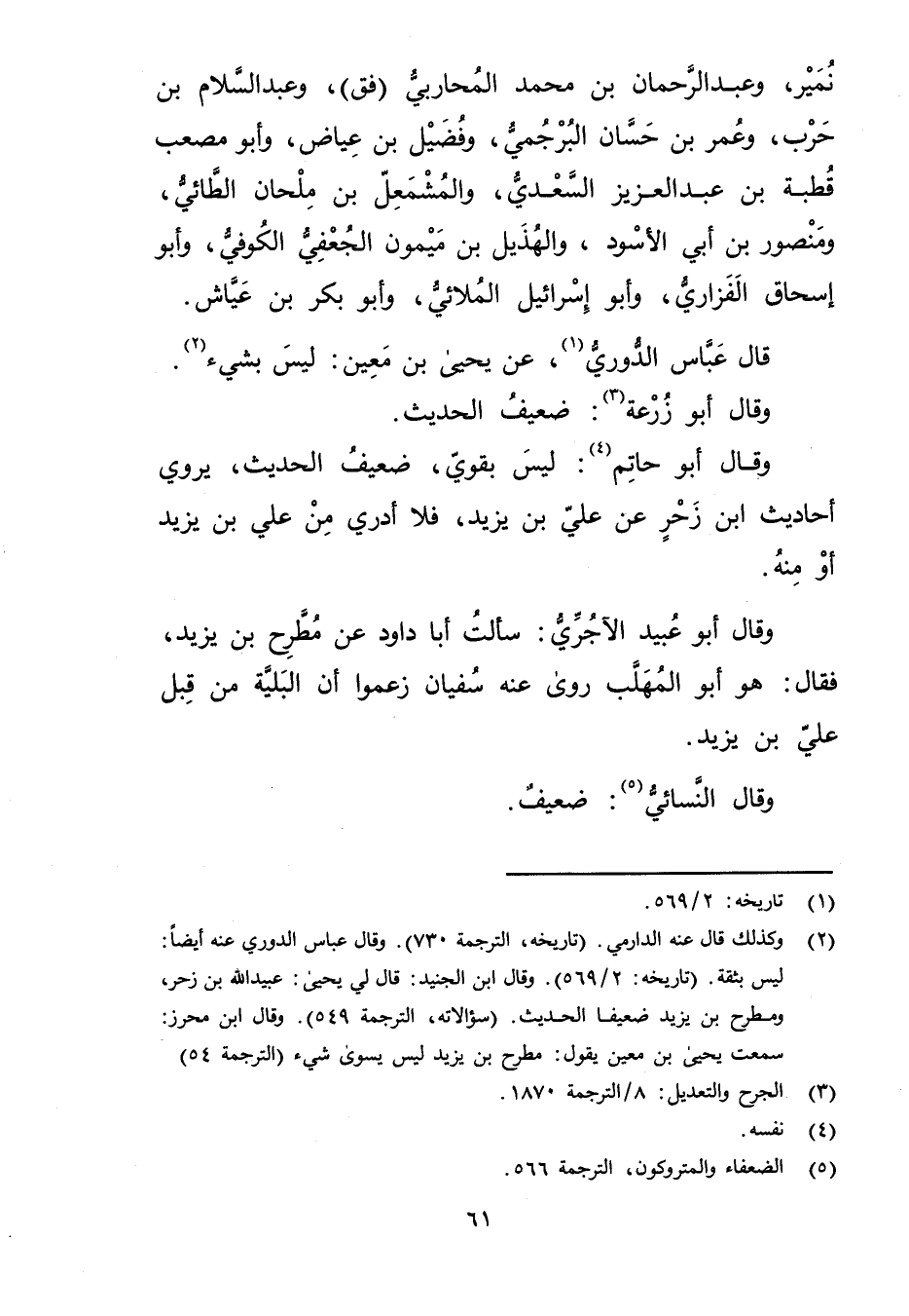 (2) وكذلك قال عنه الدارمي (تاريخه، الترجمة 730) وَقَال عَباس الدُّورِيُّ عنه أيضا: ليس بثقة (تاريخه: 2 / 569) وَقَال ابن الجنيد: قال لي يحيى: عُبَيد الله بن زحر ومطرح بن يزيد ضعيفا الحديث (سؤالاته الترجمة 549) وَقَال ابن محرز: سمعت يحيى بْن مَعِين يقول: مطرح بن يزيد ليس يسوى شيء (الترجمة 54)