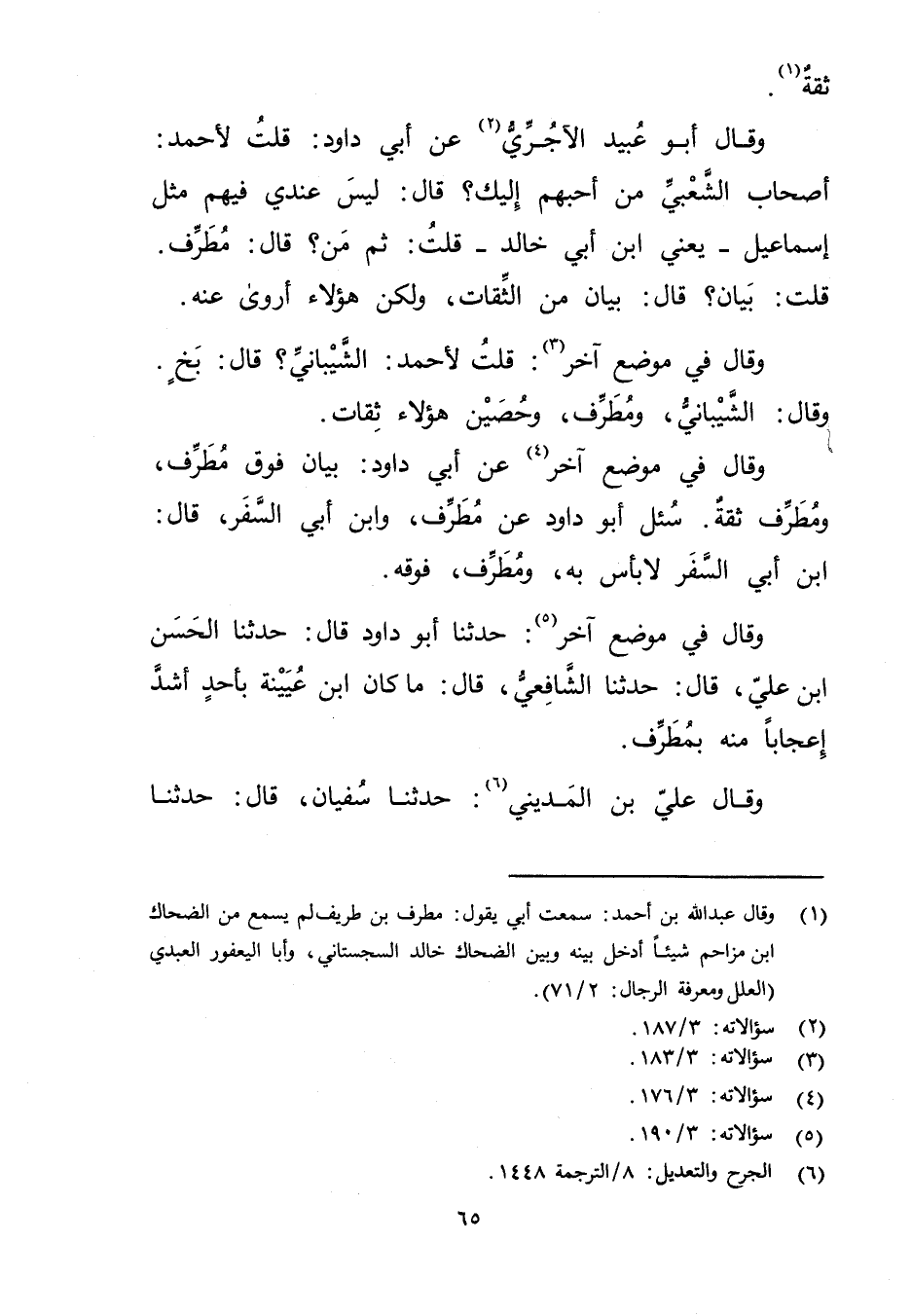 وَقَال فِي موضع آخر (4) عَن أَبِي داود: بيان فوق مطرف ومطرف ثقة سئل أَبُو داود عَن مطرف، وابن أَبي السفر قال: ابْن أَبي السفر لا بأس به، ومطرف فوقه
