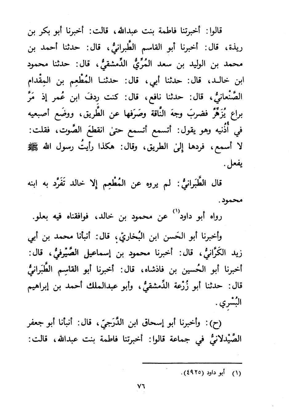 قَالُوا: أَخْبَرَتْنا فَاطِمَةُ بِنْتُ عَبد اللَّهِ، قَالَتْ: أخبرنا أَبُو بَكْرِ بْنِ رِيذَةَ قال: أخبرنا أَبُو الْقَاسِمِ الطَّبَرَانِيُّ قال: حَدَّثَنَا أَحْمَدُ بن مُحَمَّد بن الوليد بن سَعْدٍ الْمُرِّيُّ الدِّمَشْقِيُّ قال: حَدَّثَنَا محمود ابن خَالِدٍ قال: حَدَّثَنَا أَبِي، قال: حَدَّثَنَا الْمُطْعَمُ بْنُ الْمِقْدَامِ الصَّنْعَانِيُّ قال: حَدَّثَنَا نَافِعٌ، قال: كُنْتُ رِدْفَ ابْنِ عُمَر إِذْ مَرَّ بِرَاعٍ يُزَمِّرُ فَضَرَبَ وجْهَ النَّاقَةِ وصَرَفَهَا عَنِ الطَّرِيقِ، ووَضَعَ أُصْبُعَيْهِ فِي أُذُنَيْهِ وهُوَ يَقُولُ: أَتَسْمَعُ أَتَسْمَعُ حَتَّى انْقَطَعَ الصَّوْتُ فَقُلْتُ: لاأسمع فَرَدَّهَا إِلَى الطَّرِيقِ وَقَال: هَكَذَا رأيت رَسُول اللَّهِ صلى الله عَلَيْهِ وسَلَّمَ يَفْعَلُ