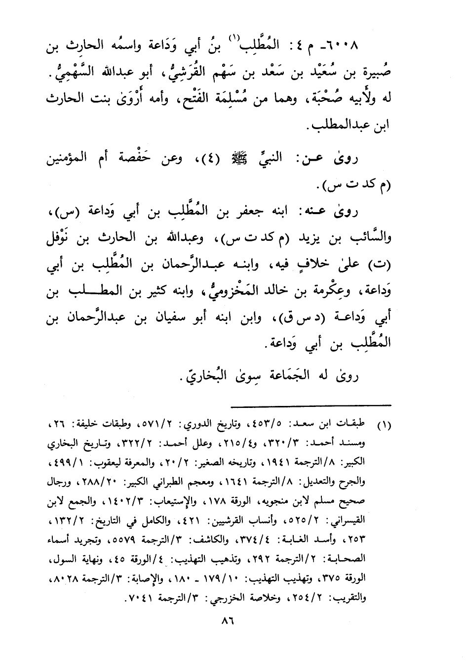 6008 - م 4: المطلب بن أَبي وداعة واسمه الحارث بن صبيرة بن سَعِيد بن سَعْد بن سهم القرشي (1) ، أَبُو عَبد اللَّهِ السهمي لَهُ ولأبيه صحبة، وهما من مسلمة الفتح، وأمه أروى بنت الحارث ابن عبد المطلب