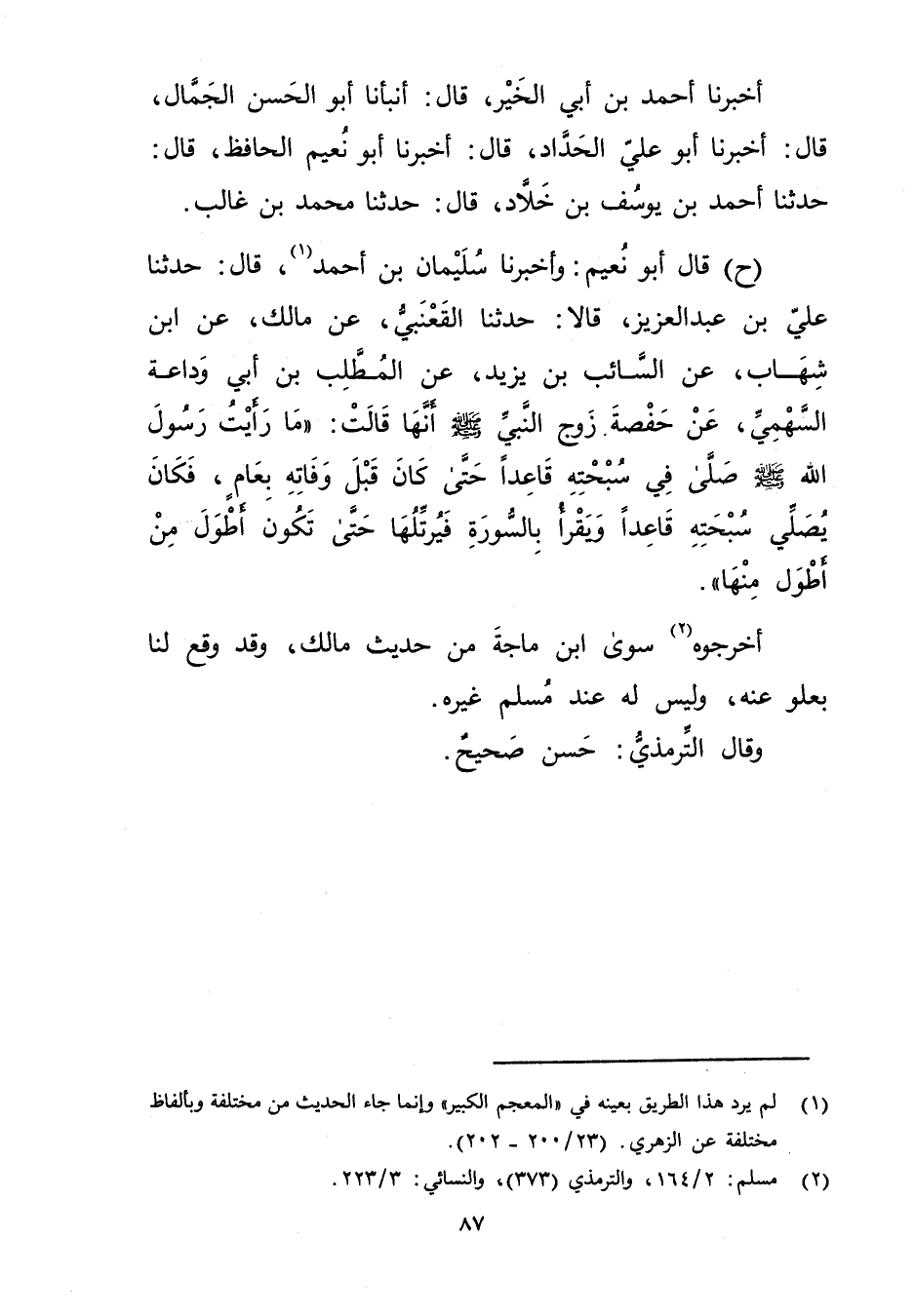 (ح) قال أَبُو نُعَيْمٍ: وأخبرنا سُلَيْمان بْنُ أَحْمَدَ (1) قال: حَدَّثَنَا علي بْن عبد الْعَزِيزِ، قَالا: حَدَّثَنَا الْقَعْنَبِيُّ، عَنْ مالك، عَنِ ابْنِ شِهَابٍ، عن السَّائِبِ بْنِ يَزِيدَ، عَنِ الْمُطَّلِبِ بْنِ أَبي ودَاعَةَ السَّهْمِيِّ، عَنْ حَفْصَةَ زَوْجِ النَّبِيِّ صَلَّى اللَّهُ عَلَيْهِ وسَلَّمَ أَنَّهَا قَالَتْ: "مَا رأيت رَسُول اللَّهِ صلى الله عليه وسلم صلى فِي سُبْحَتِهِ قَاعِدًا حَتَّى كَانَ قَبْلَ وفَاتِهِ بِعَامٍ، فَكَانَ يُصَلِّي سُبْحَتَهُ قَاعِدًا ويَقْرَأُ بِالسُّورَةِ فَيُرَتِّلُهَا حَتَّى تَكُونَ أَطْوَلَ مِنْ أَطْوَلِ مِنْهَا "