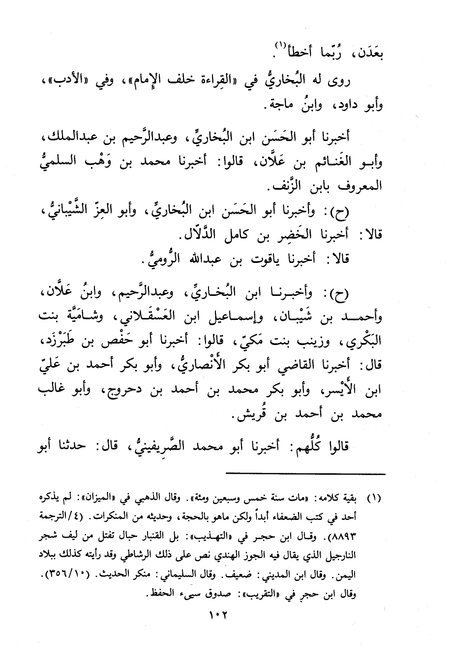 (ح) : وأَخبرنا ابْنُ الْبُخَارِيِّ، وعَبد الرَّحِيمِ، وابْنُ عَلانَ، وأَحمد بن شَيْبَانَ، وإِسماعيل ابن العسقلاني، وشَامِيَّةُ بِنْتُ الْبَكْرِيِّ، وزَيْنَبُ بِنْتُ مَكِّيٍّ، قَالُوا: أَخبرنا أَبُو حَفْصٍ بن طَبَرْزَذَ، قال: أَخبرنا الْقَاضِي أَبُو بَكْرٍ الأَنْصارِيّ، وأبُو بُكر أَحْمَدُ بْنُ علي ابن الأَيْسَرِ، وأبُو بُكر مُحَمَّدُ بْنُ أَحْمَدَ بْنِ دُحْرُوجٍ، وأَبُو غَالِبٍ مُحَمَّدُ بْنُ أَحْمَدَ بْنِ قُرَيْشٍ.