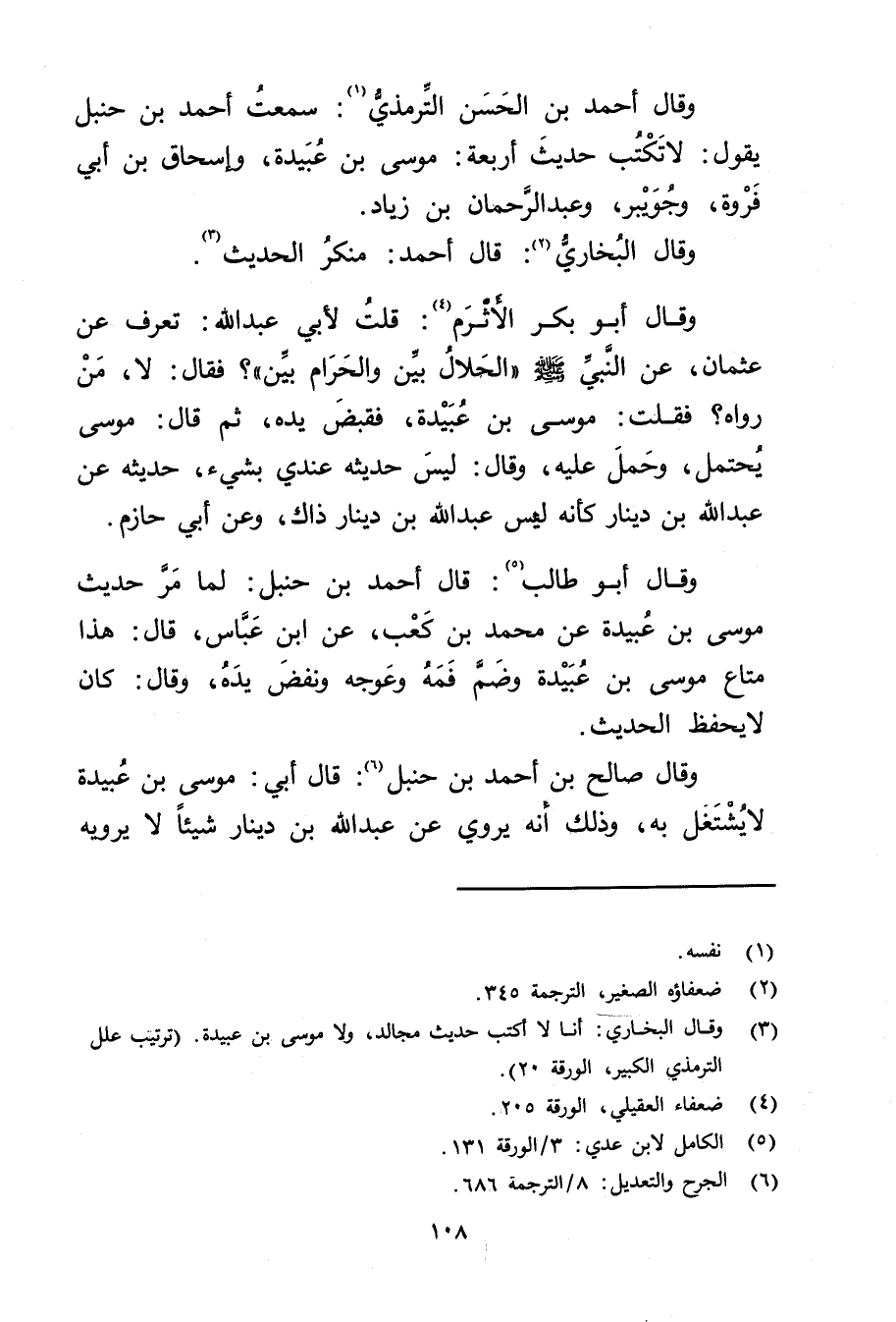(3) وقَال البُخارِيُّ: أنا لا أكتب حديث مجالد، ولا موسى بن عُبَيدة. (ترتيب علل التِّرْمِذِيّ الكبير، الورقة 20) .