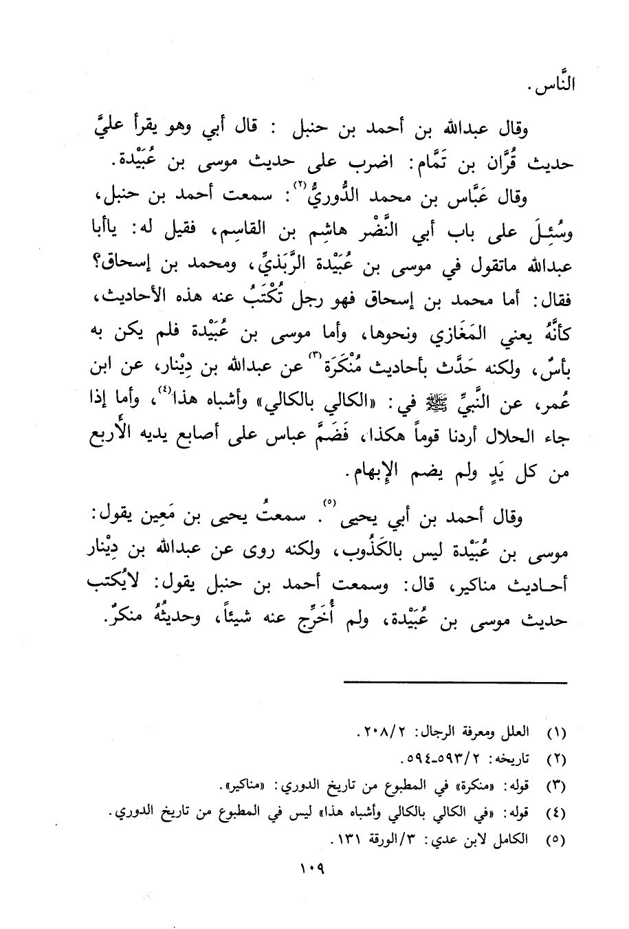 وَقَال عباس بْن مُحَمَّد الدوري (2) : سمعت أَحْمَد بن حَنْبَلٍ، وسئل عَلَى باب أبي النضر هاشم بْن القاسم، فقيل له: يا أبا عَبد اللَّهِ ما تقول فِي مُوسَى بن عُبَيدة الربذي، ومحمد بن إِسْحَاقَ؟ فَقَالَ: أما مُحَمَّد بن إِسْحَاقَ فهو رجل تكتب عَنْهُ هَذِهِ الأحاديث، كأنه يعني المغازي ونحوها، وأما مُوسَى بن عُبَيدة فلم يكن بِهِ بأس، ولكنه حدث بأحاديث منكرة (3) عَنْ عَبد اللَّهِ بْنُ دِينَارٍ، عَنِ ابْنِ عُمَر، عَن النَّبِيِّ صَلَّى اللَّهُ عليه وسلم فِي: الكالي بالكالي" وأشباه هَذَا (4) ، وأما إِذَا جاء الحلال أردنا قوما هكذا، فضم عباس عَلَى أصابع يديه الأربع من كل يد ولم يضم الإبهام.