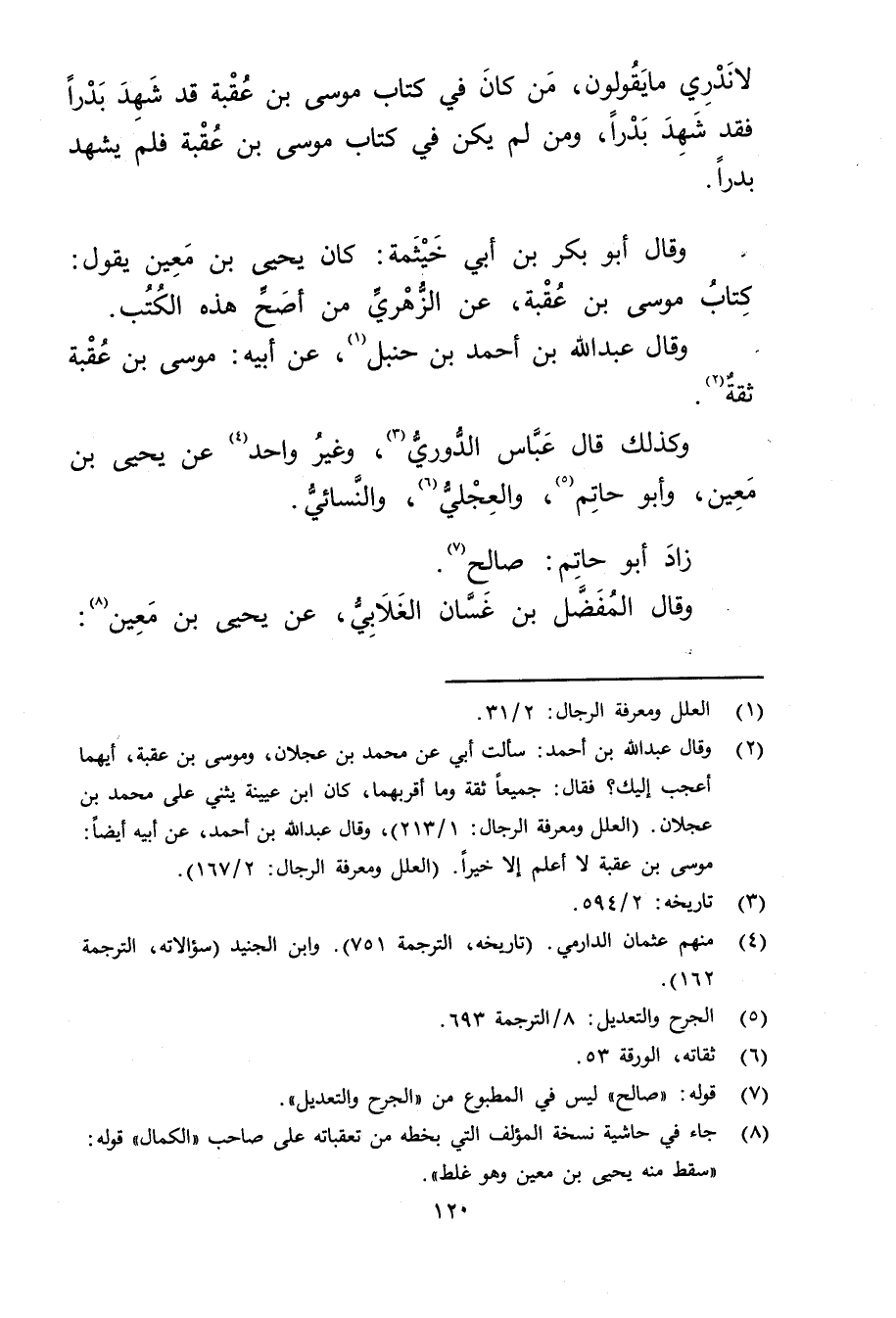 (2) وَقَال عَبد اللَّهِ بْن أَحْمَد: سَأَلتُ أَبِي عَنْ مُحَمَّد بْن عجلان، وموسى بن عقبة، أيهما أعجب إليك؟ فقال: جميعا ثقة وما أقربهما، كان ابن عُيَيْنَة يثني على مُحَمَّد بن عجلان. (العلل ومعرفة الرجال: 1 / 213) ، وَقَال عَبد اللَّهِ بْن أَحْمَد، عَن أبيه ايضا: موسى بن عقبة لا أعلم الا خيرا. (العلل ومعرفة الرجال: 2 / 167) .