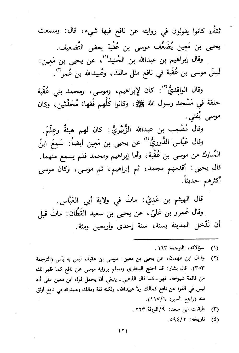 (2) وَقَال ابن طهمان، عن يَحْيَى بن مَعِين: مُوسَى بن عقبة، ليس به بأس (الترجمة 353) . قال بشار: قد احتج البخاري ومسلم برواية موسى عن نافع كما ظهر لك من قائمة شيوخه، فهو - كما قال الذهبي - ينبغي ان يحمل قول ابن مَعِين على انه ليس في القوة عن نافع كمالك ولا عُبَيد الله، ولكنه ثقة ومالك وعُبَيد الله في نافع أوثق منه (راجع السير: 6 / 117) .