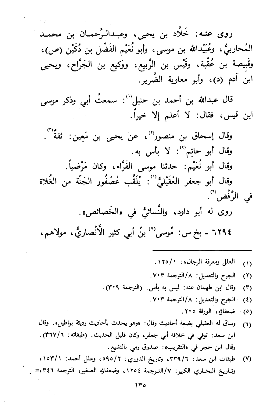 (7) طبقات ابن سعد: 6 / 339، وتاريخ الدوري: 2 / 595، وعلل أحمد: 1 / 153، وتاريخ البخاري الكبير: 7 / الترجمة 1254، وضعفاؤه الصغير، الترجمة 346، =