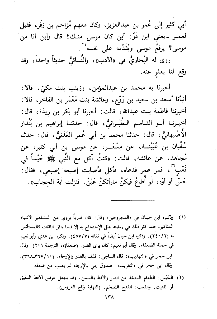 أَخبرنا به محمد بن عبد المؤمن، وزَيْنَبُ بِنْتُ مَكِّيٍّ، قَالا: أَنَبَأَنَا أَسْعَدَ بْنِ سَعِيد بْنِ رَوْحٍ، وعَائِشَةُ بِنْتُ مَعْمَرِ بْنِ الْفَاخِرِ، قَالا: أخَبْرَتْنَا فَاطِمَةُ بِنْتُ عَبد اللَّهِ، قَالَتْ: أخبرنا أَبُو بَكْرِ بْنِ رِيذَةَ، قال: أَخبرنا أَبُو الْقَاسِمِ الطَّبَرَانِيُّ، قال: حَدَّثَنَا إِبْرَاهِيمُ بْنُ بُنْدَارٍ الأَصْبَهَانِيُّ، قال: حَدَّثَنَا مُحَمَّدُ بْنُ أَبي عُمَر الْعَدَنِيُّ، قال: حَدَّثَنَا سُفْيَانُ بْنُ عُيَيْنَة، عَنْ مِسْعَرٍ، عَنْ مُوسَى بْنِ أَبي كَثِيرٍ، عَنْ مُجَاهِدٍ، عَنْ عَائِشَةَ، قَالَتْ: كُنْتُ آكُلُ مَعَ النَّبِيُّ صلى الله عليه وسلم حَيْسًا فِي قَعْبٍ (2) ، فَمَرَّ عُمَر فدعاه، فأكل فأصابت إِصْبَعُهُ إِصْبَعِي، فَقَالَ: حَسِّ أَوْ أَوَّهْ، لَوْ أُطَاعُ فِيكُنَّ مَا رَأَتْكُنَّ عَيْنٌ. فَنَزَلَتْ آيَةُ الْحِجَابِ.