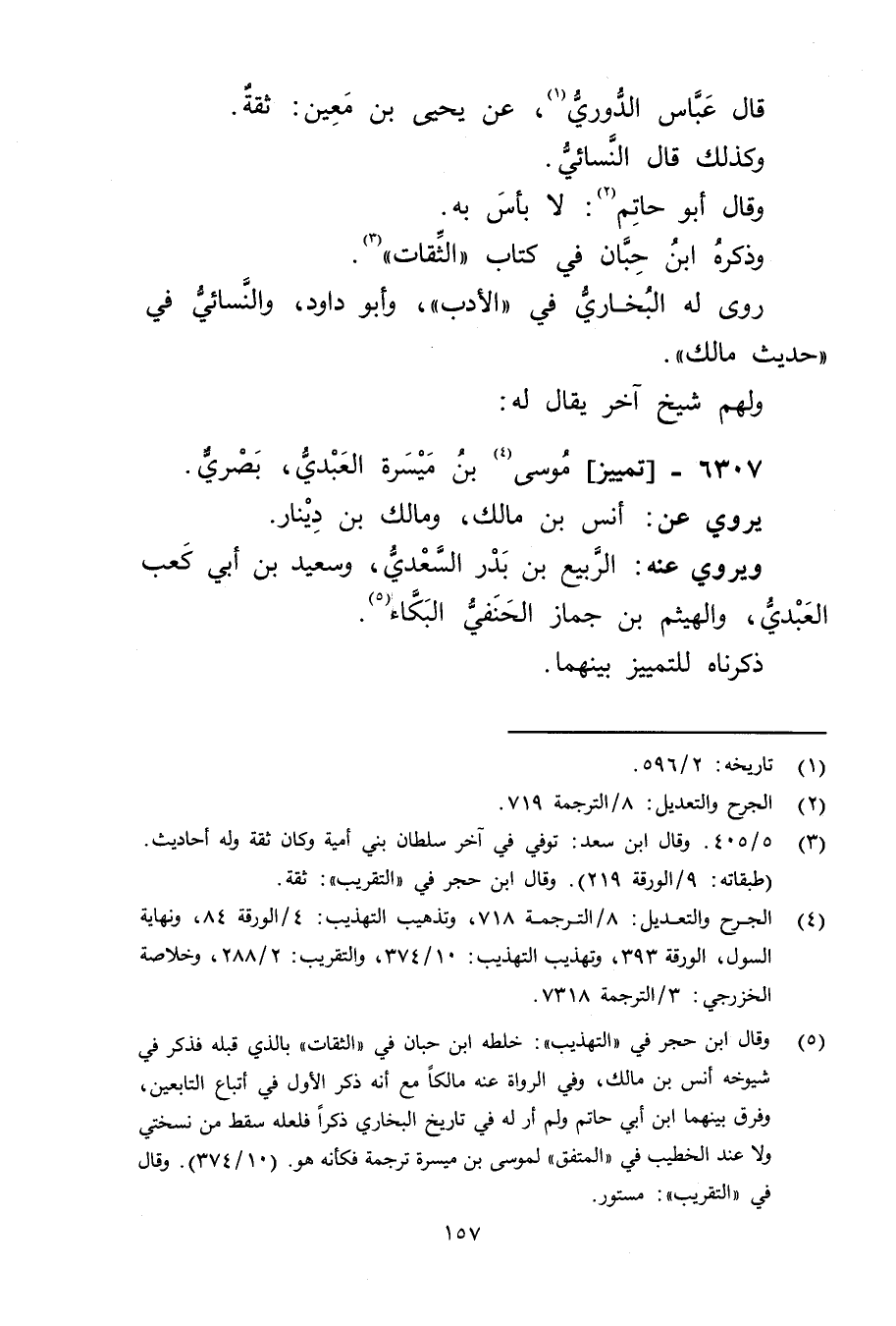 (5) وَقَال ابن حجر في " التهذيب": خلطه ابن حبان في "الثقات" بالذي قبله فذكر في شيوخه أنس بن مالك، وفي الرواة عنه مالكا مع انه ذكر الاول في اتباع التابعين، وفرق بينهما ابن أَبي حاتم ولم أر له في تاريخ البخاري ذكرا فلعله سقط من نسختي ولا عند الخطيب في " المتفق" لموسى بن ميسرة ترجمة فكأنه هو. (10 / 374) . وَقَال في "التقريب": مستور.