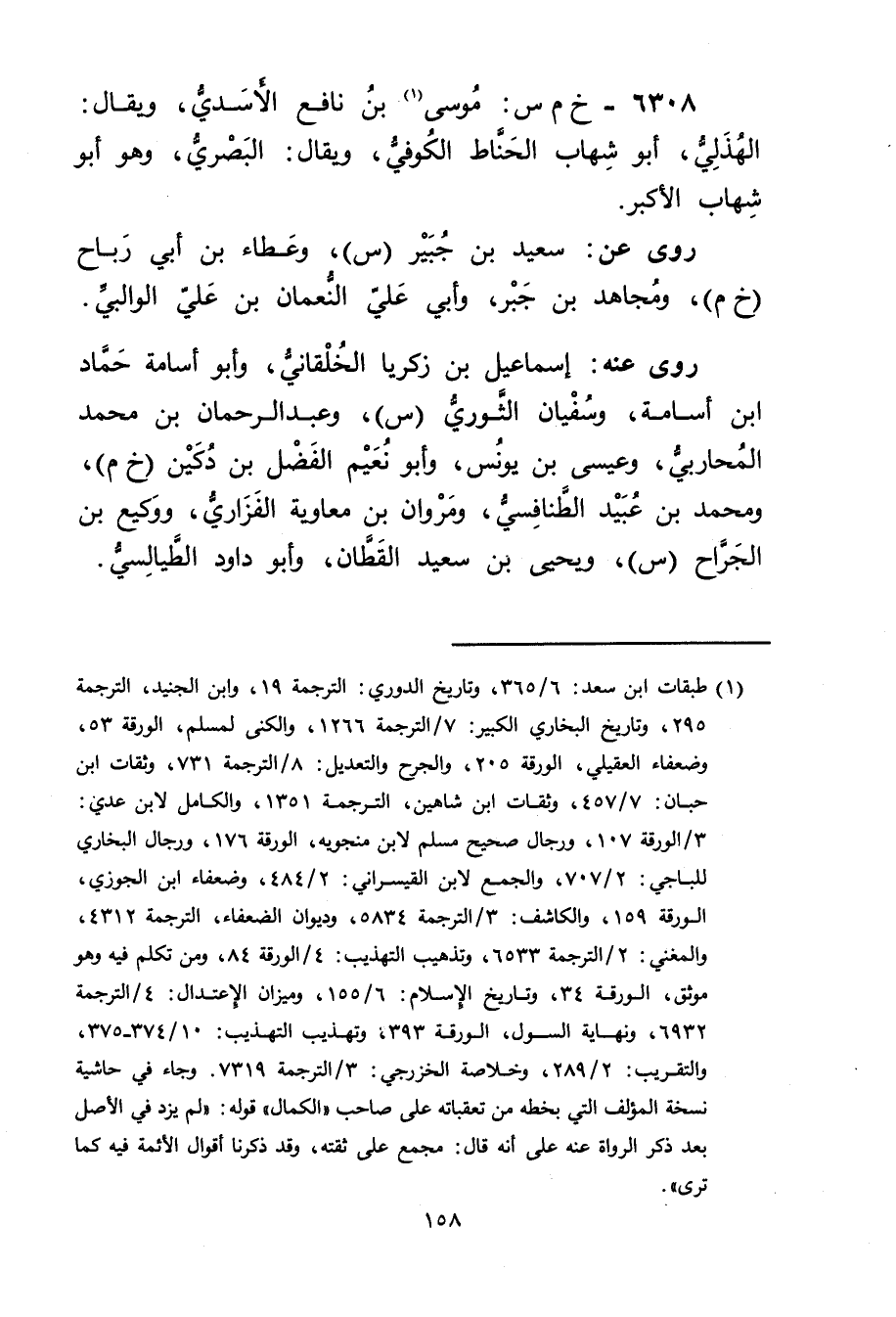 6308 - خ م س: مُوسَى بن نافع الأسدي (1) ، ويُقال: الهذلي، أَبُو شهاب الحناط الكوفي، ويُقال: البَصْرِيّ، وهُوَ أَبُو شهاب الأكبر.